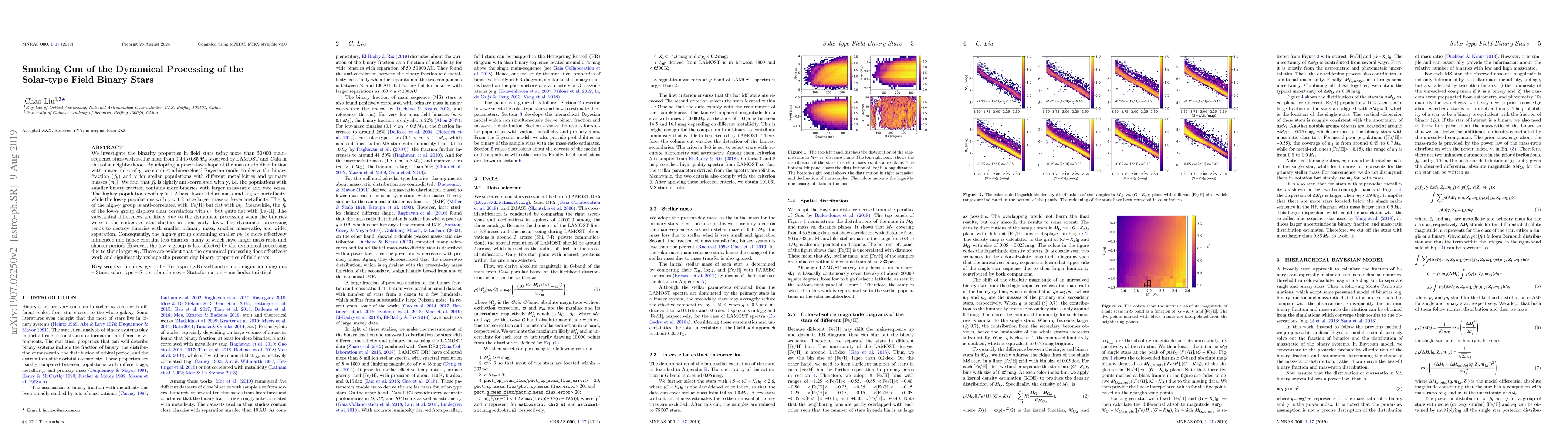 We investigate the binarity properties in field stars using more than 50\,000 main-sequence stars with stellar mass from 0.4 to 0.85\,$M_\odot$ observed by LAMOST and {\emph Gaia} in the solar neighborhood. By adopting a power-law shape of the mass-ratio distribution with power index of $\gamma$, we conduct a hierarchical Bayesian model to derive the binary fraction ($f_{b}$) and $\gamma$ for stellar populations with different metallicities and primary masses ($m_1$). We find that $f_b$ is tightly anti-correlated with $\gamma$, i.e. the populations with smaller binary fraction contains more binaries with larger mass-ratio and vice versa.The high-$\gamma$ populations with $\gamma>1.2$ have lower stellar mass and higher metallicity, while the low-$\gamma$ populations with $\gamma<1.2$ have larger mass or lower metallicity. The $f_b$ of the high-$\gamma$ group is anti-correlated with [Fe/H] but flat with $m_1$.Meanwhile, the $f_b$ of the low-$\gamma$ group displays clear correlation with $m_1$ but quite flat with [Fe/H]. The substantial differences are likely due to the dynamical processing when the binaries were in the embedded star clusters in their early days. The dynamical processing tends to destroy binaries with smaller primary mass, smaller mass-ratio, and wider separation. Consequently, the high-$\gamma$ group containing smaller $m_1$ is more effectively influenced and hence contains less binaries, many of which have larger mass-ratio and shorter period. However, the low-$\gamma$ group is less affected by the dynamical processing due to their larger $m_1$. These are evident that the dynamical processing does effectively work and significantly reshape the present-day binary properties of field stars.