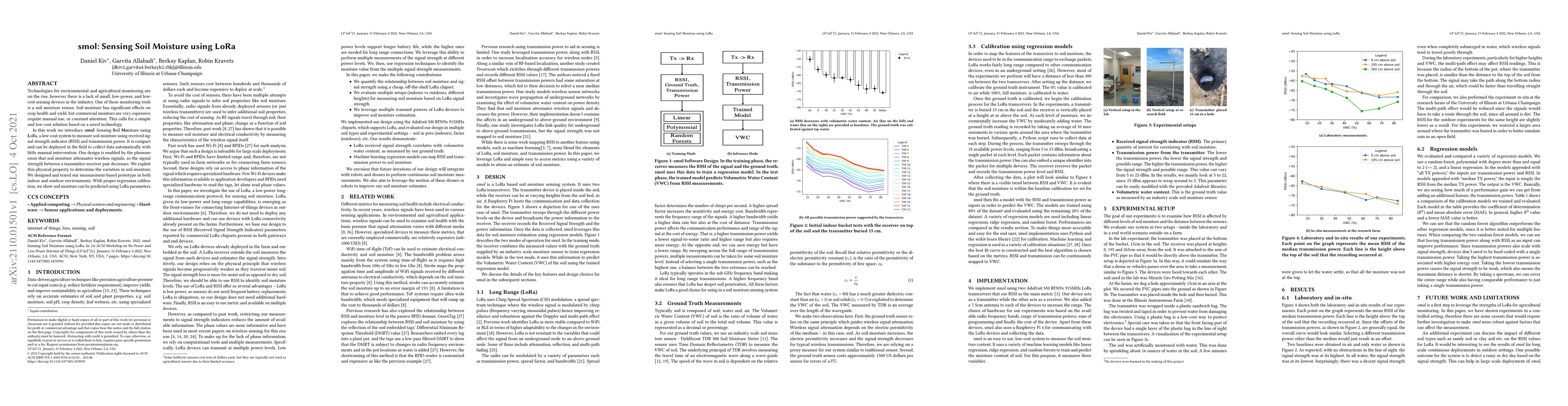 The paper introduces smol, a low-cost soil moisture sensor using LoRa technology, which measures soil moisture by analyzing signal strength attenuation. The prototype demonstrates accurate soil moisture prediction through regression calibration in both indoor and outdoor settings.