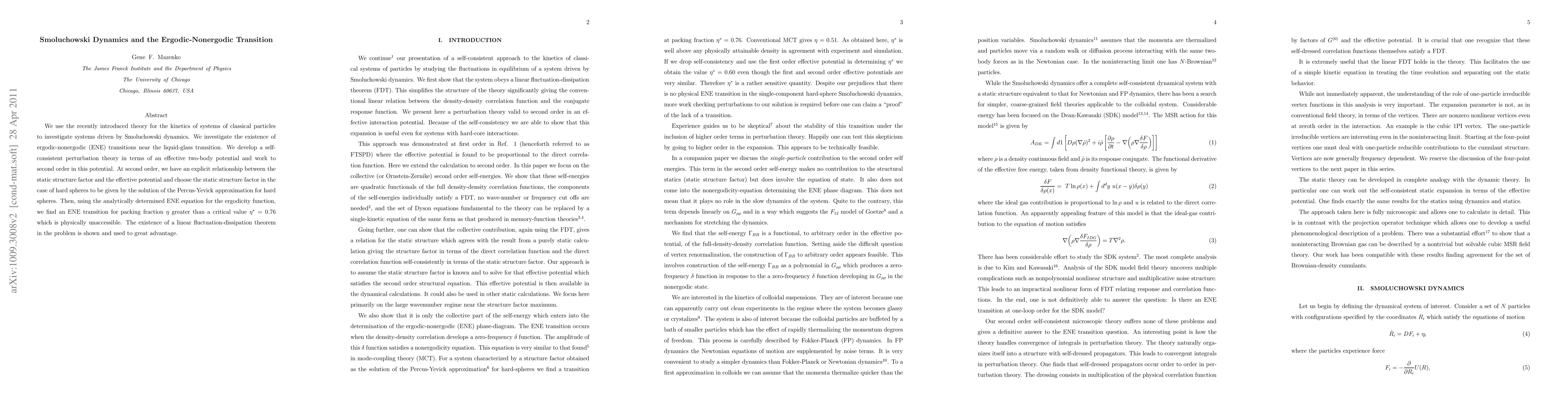 This paper explores the kinetics of classical particle systems under Smoluchowski dynamics, focusing on the ergodic-nonergodic (ENE) transition near the liquid-glass transition. It develops a self-consistent perturbation theory to second order and finds an ENE transition at a packing fraction greater than eta* = 0.76, though this value is physically unattainable.