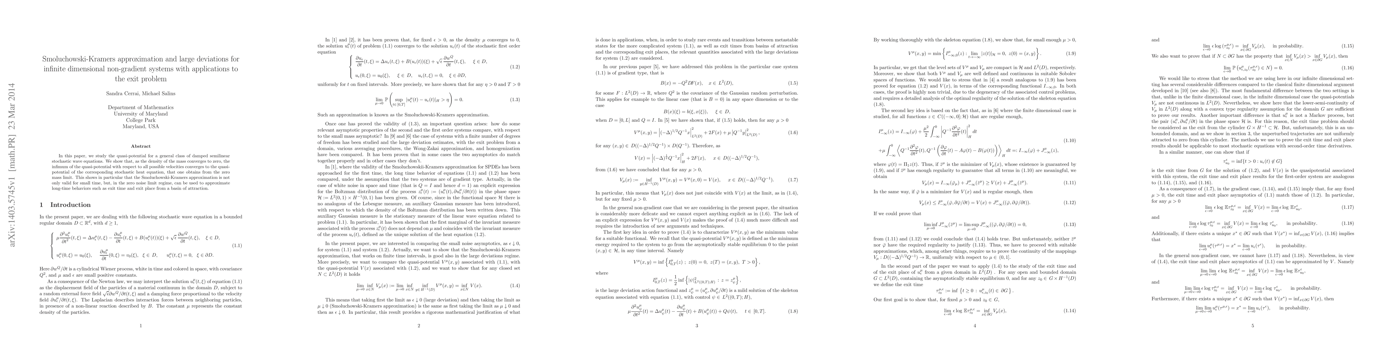 This research derives the Smoluchowski-Kramers approximation for long-time behavior in infinite dimensional non-gradient systems. It demonstrates that as the mass density approaches zero, the infimum of quasi-potential for damped semilinear stochastic wave equations converges to that of the corresponding stochastic heat equation, applicable for approximating exit times and places from attraction basins.