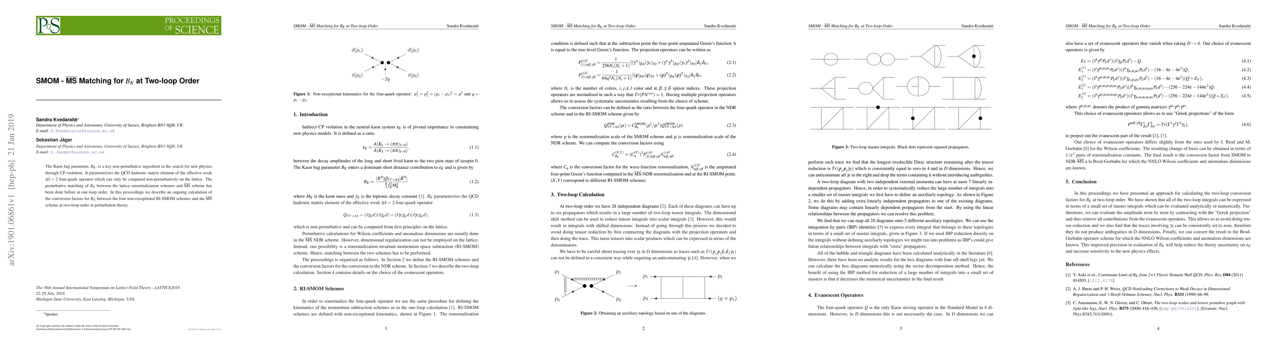 This paper details the ongoing calculation of two-loop perturbative matching factors for the Kaon bag parameter $B_K$, which connects lattice renormalization schemes (RI-SMOM) to the $\overline{\mbox{MS}}$ scheme. This work aims to refine the non-perturbative computation of CP-violation in the context of new physics searches.