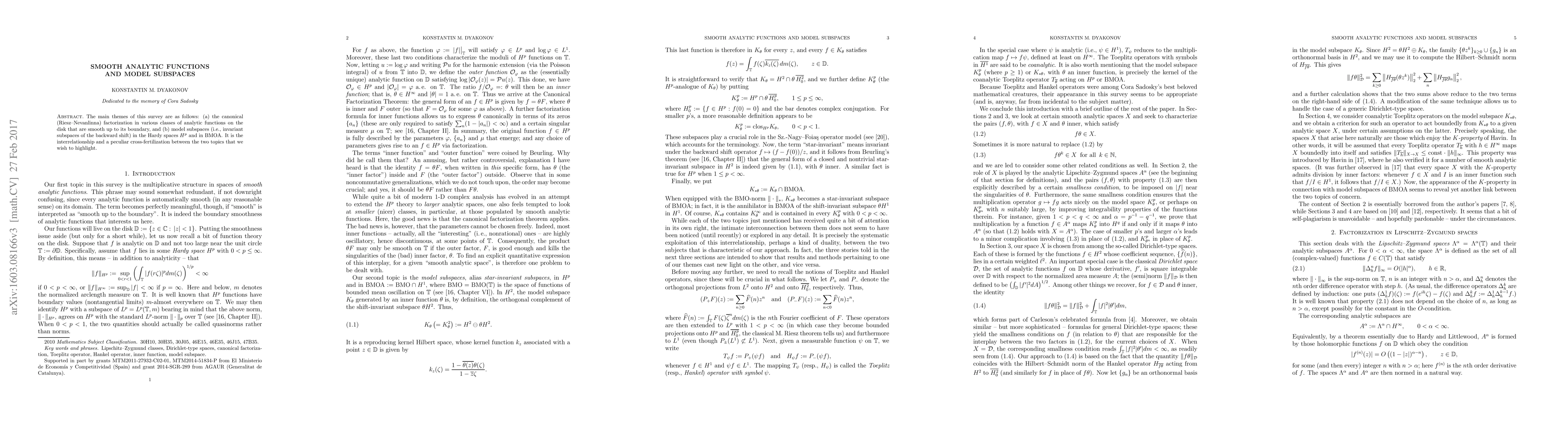 This survey explores the interconnection between smooth analytic functions on the disk and model subspaces in Hardy spaces and BMOA, highlighting their canonical factorization and invariant properties.