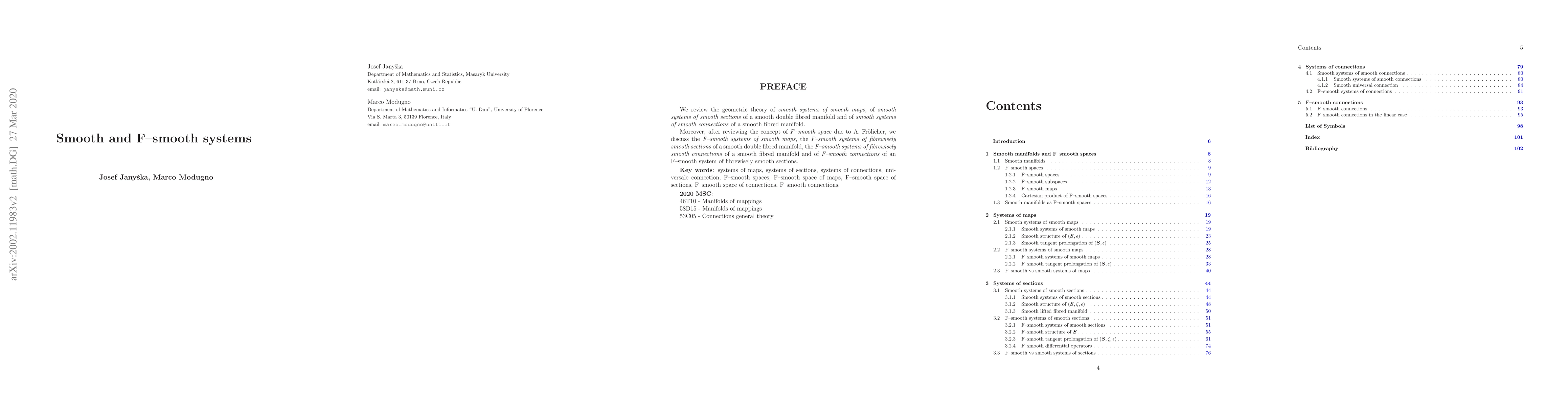 We review the geometric theory of \emp{smooth systems of smooth maps}, of \emp{smooth systems of smooth sections} of a smooth double fibred manifold and of \emp{smooth systems of smooth connections} of a smooth fibred manifold. Moreover, after reviewing the concept of \emp{F-smooth space} due to A. Fr\"olicher, we discuss the \emp{F-smooth systems of smooth maps}, the \emp{F-smooth systems of fibrewisely smooth sections} of a smooth double fibred manifold, the \emp{F-smooth systems of fibrewisely smooth connections} of a smooth fibred manifold and of \emp{F-smooth connections} of an F-smooth system of fibrewisely smooth sections.