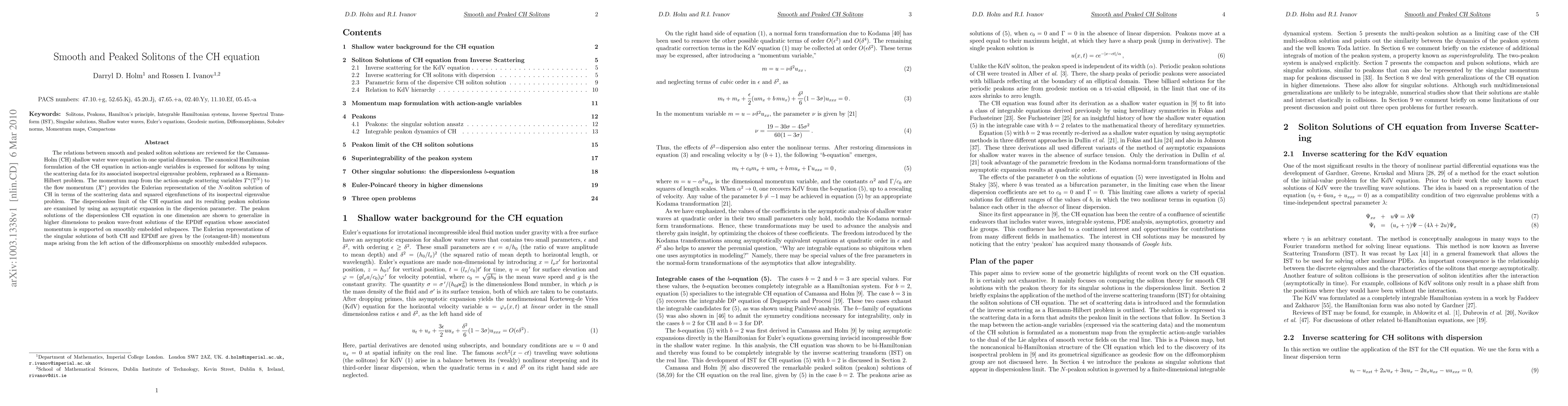 The relations between smooth and peaked soliton solutions are reviewed for the Camassa-Holm (CH) shallow water wave equation in one spatial dimension. The canonical Hamiltonian formulation of the CH equation in action-angle variables is expressed for solitons by using the scattering data for its associated isospectral eigenvalue problem, rephrased as a Riemann-Hilbert problem. The momentum map from the action-angle scattering variables $T^*({\mathbb{T}^N})$ to the flow momentum ($\mathfrak{X}^*$) provides the Eulerian representation of the $N$-soliton solution of CH in terms of the scattering data and squared eigenfunctions of its isospectral eigenvalue problem. The dispersionless limit of the CH equation and its resulting peakon solutions are examined by using an asymptotic expansion in the dispersion parameter. The peakon solutions of the dispersionless CH equation in one dimension are shown to generalize in higher dimensions to peakon wave-front solutions of the EPDiff equation whose associated momentum is supported on smoothly embedded subspaces. The Eulerian representations of the singular solutions of both CH and EPDiff are given by the (cotangent-lift) momentum maps arising from the left action of the diffeomorphisms on smoothly embedded subspaces.