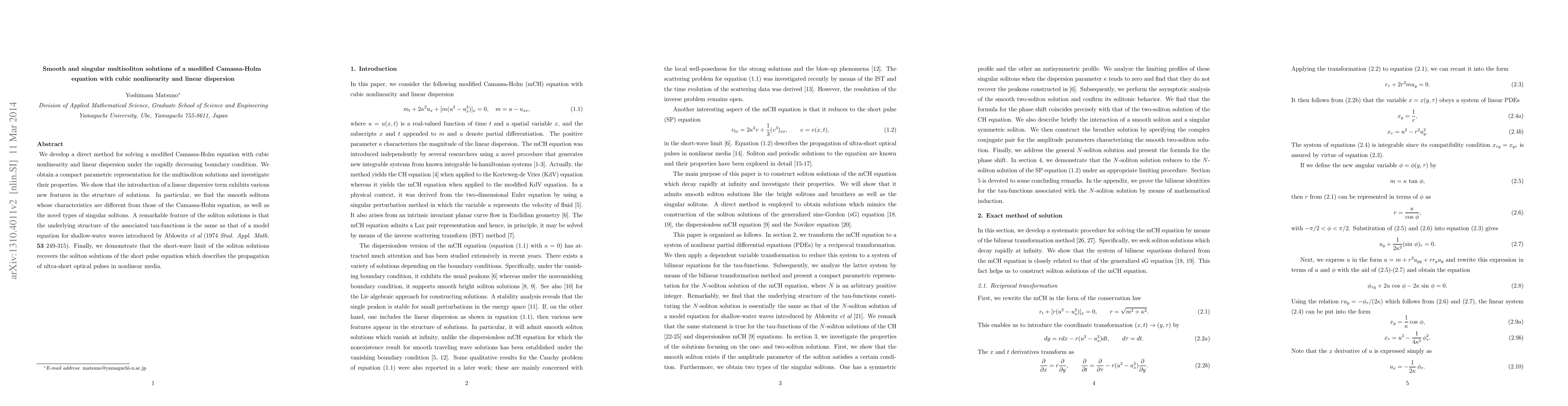 This paper develops a method to solve a modified Camassa-Holm equation with cubic nonlinearity and linear dispersion, revealing smooth and singular multisoliton solutions. The study finds novel soliton characteristics and types, and shows the underlying tau-function structure aligns with shallow-water wave models, while the short-wave limit connects to the short pulse equation for optical pulse propagation.