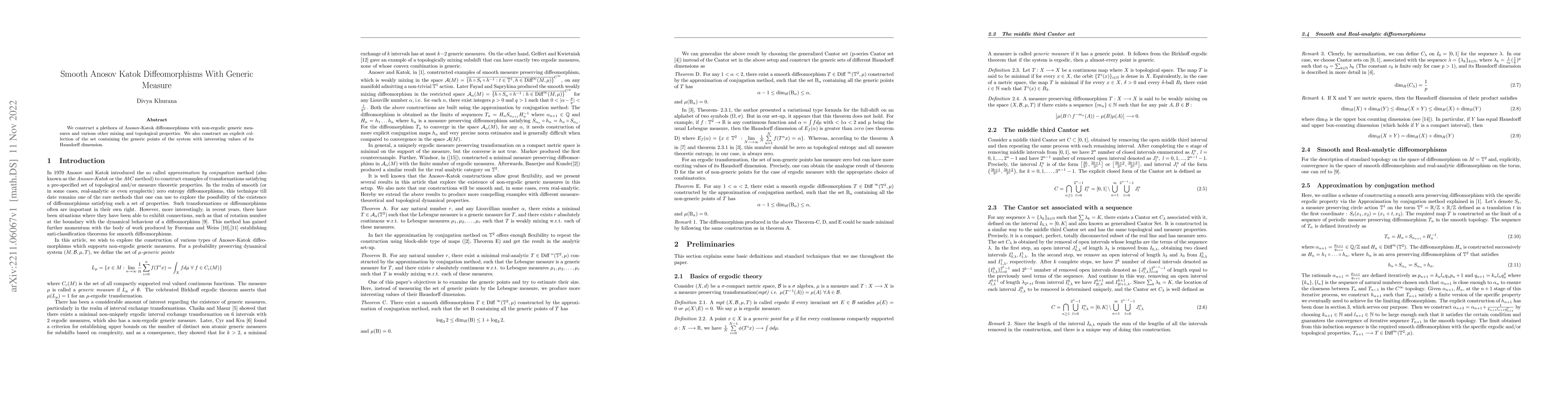 This paper constructs numerous smooth Anosov-Katok diffeomorphisms featuring non-ergodic generic measures and explores various mixing and topological properties, including an explicit set of generic points with notable Hausdorff dimension values.