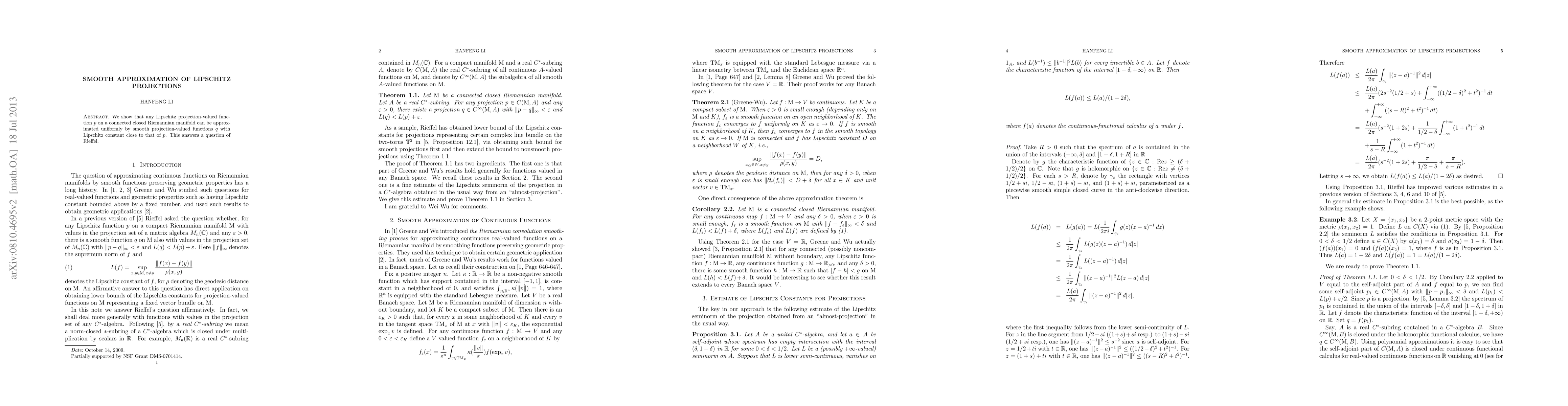 Summary: The paper demonstrates that Lipschitz projection-valued functions on connected closed Riemannian manifolds can be uniformly approximated by smooth projection-valued functions with Lipschitz constants close to the original, addressing a question posed by Rieffel.