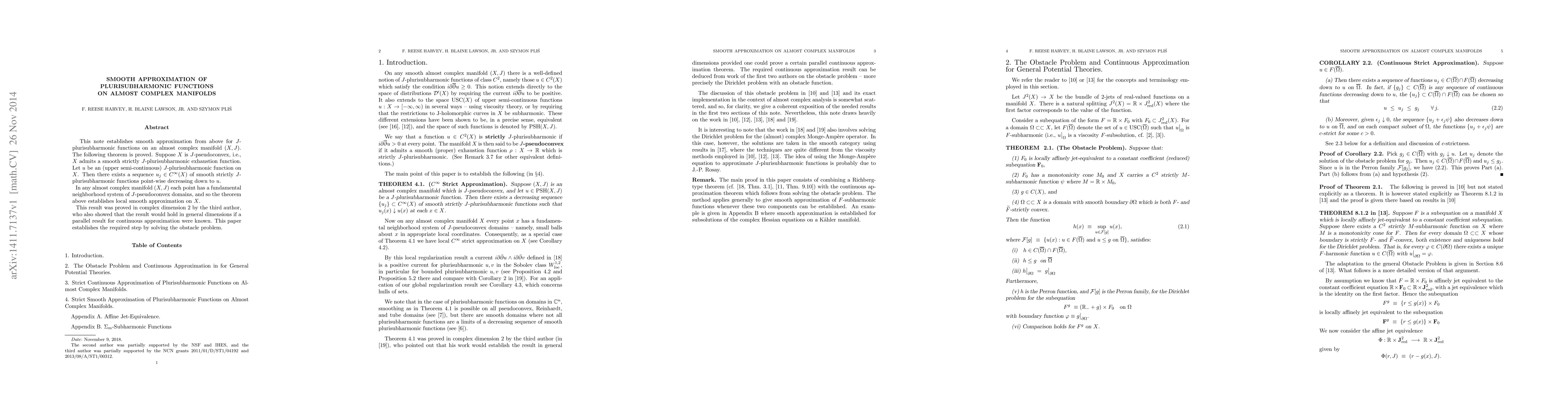 This note establishes smooth approximation from above for J-plurisubharmonic functions on an almost complex manifold (X,J). The following theorem is proved. Suppose X is J-pseudoconvex, i.e., X admits a smooth strictly J-plurisubharmonic exhaustion function. Let u be an (upper semi-continuous) J-plurisubharmonic function on X. Then there exists a sequence {u_j} of smooth, strictly J-plurisubharmonic functions point-wise decreasing down to u. On any almost complex manifold (X,J) each point has a fundamental neighborhood system of J-pseudoconvex domains, and so the theorem above establishes local smooth approximation on X. This result was proved in complex dimension 2 by the third author, who also showed that the result would hold in general dimensions if a parallel result for continuous approximation were known. This paper establishes the required step by solving the obstacle problem.