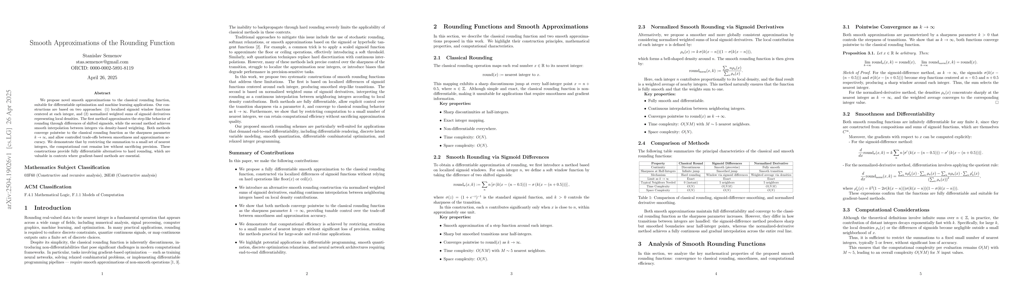 The paper introduces two novel smooth approximations to the rounding function, both of which are fully differentiable and converge to the classical rounding function as the sharpness parameter k increases.