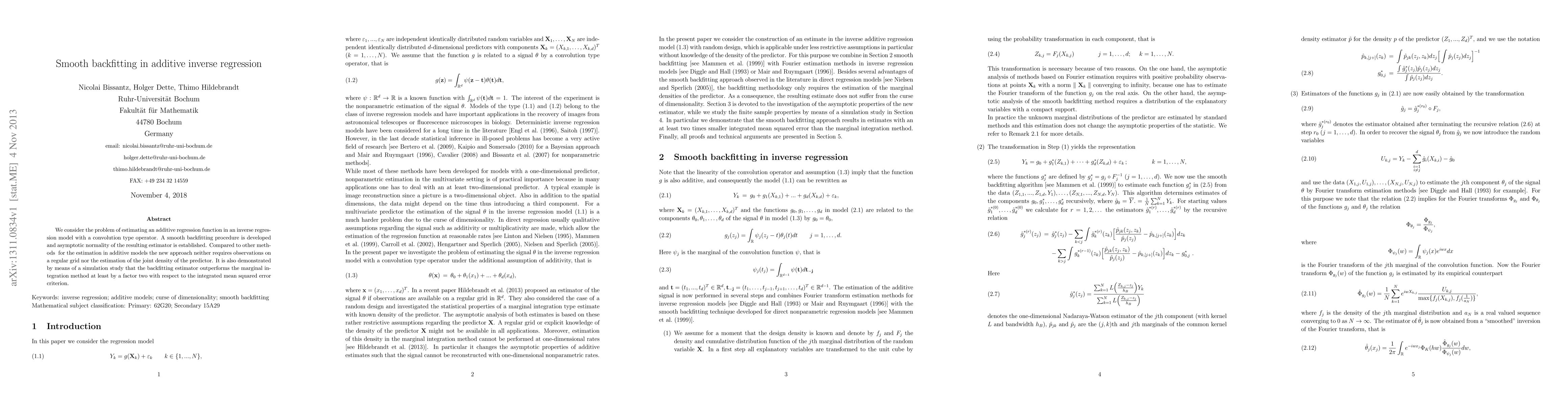 This paper introduces a smooth backfitting procedure for estimating additive regression functions in inverse regression models, demonstrating its asymptotic normality and superior performance over the marginal integration method in simulations. Unlike other methods, it does not require observations on a regular grid or joint density estimation.