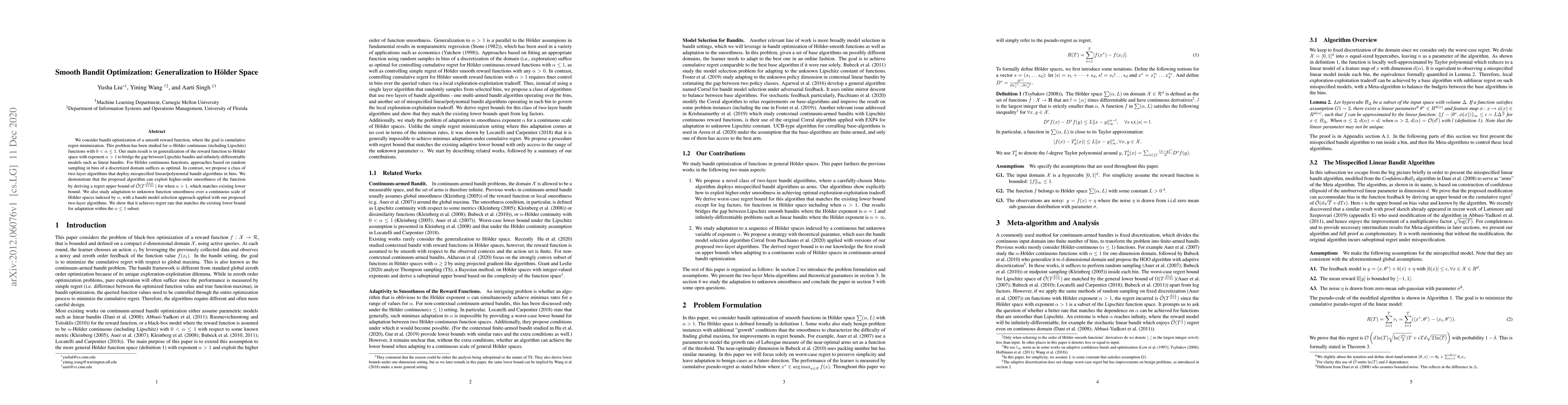 We consider bandit optimization of a smooth reward function, where the goal is cumulative regret minimization. This problem has been studied for $\alpha$-H\"older continuous (including Lipschitz) functions with $0<\alpha\leq 1$. Our main result is in generalization of the reward function to H\"older space with exponent $\alpha>1$ to bridge the gap between Lipschitz bandits and infinitely-differentiable models such as linear bandits. For H\"older continuous functions, approaches based on random sampling in bins of a discretized domain suffices as optimal. In contrast, we propose a class of two-layer algorithms that deploy misspecified linear/polynomial bandit algorithms in bins. We demonstrate that the proposed algorithm can exploit higher-order smoothness of the function by deriving a regret upper bound of $\tilde{O}(T^\frac{d+\alpha}{d+2\alpha})$ for when $\alpha>1$, which matches existing lower bound. We also study adaptation to unknown function smoothness over a continuous scale of H\"older spaces indexed by $\alpha$, with a bandit model selection approach applied with our proposed two-layer algorithms. We show that it achieves regret rate that matches the existing lower bound for adaptation within the $\alpha\leq 1$ subset.
