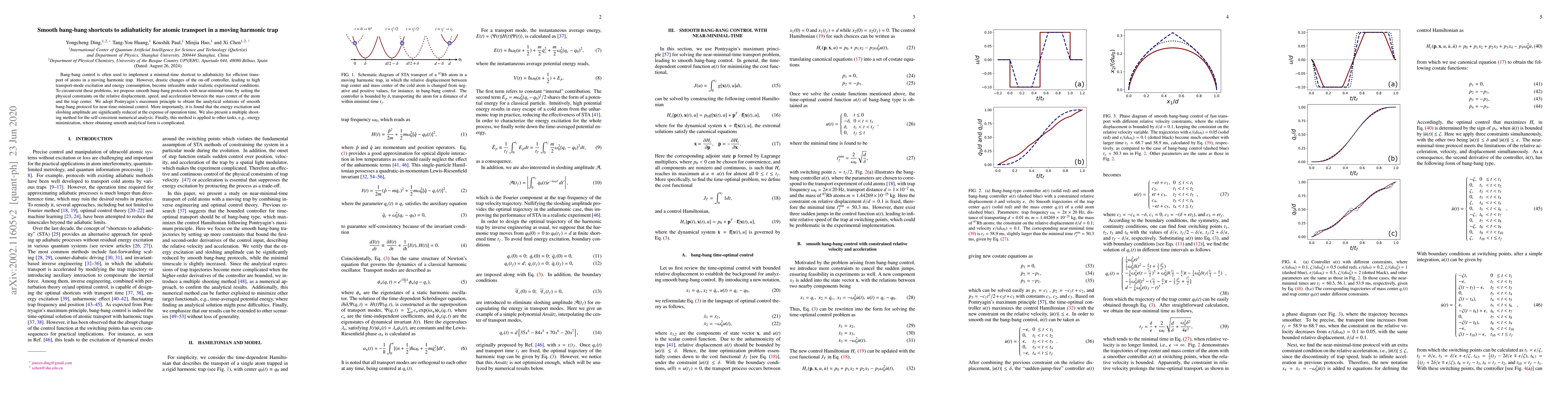 Bang-bang control is often used to implement a minimal-time shortcut to adiabaticity for efficient transport of atoms in a moving harmonic trap. However, drastic changes of the on-off controller, leading to high transport-mode excitation and energy consumption, become infeasible under realistic experimental conditions. To circumvent these problems, we propose smooth bang-bang protocols with near-minimal time, by setting the physical constraints on the relative displacement, speed, and acceleration between the mass center of the atom and the trap center. We adopt Pontryagin's maximum principle to obtain the analytical solutions of smooth bang-bang protocol for near-time-minimal control. More importantly, it is found that the energy excitation and sloshing amplitude are significantly reduced at the expense of operation time. We also present a multiple shooting method for the self-consistent numerical analysis. Finally, this method is applied to other tasks, e.g., energy minimization, where obtaining smooth analytical form is complicated.