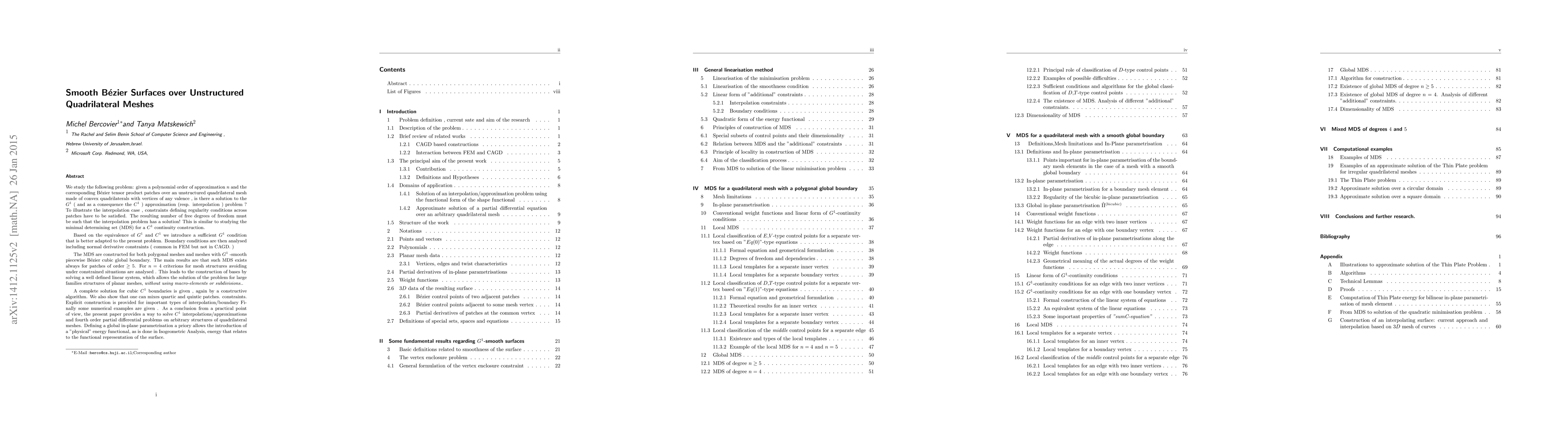 We solve the following problem: given a polynomial of order $n$ and the corresponding $B\'ezier$ tensor product patches over an unstructured regular quadrilateral mesh of any valence, find a solution to the $G^{1}1$ or $C^{1}1$ approximation (resp. interpolation) problem ! Constraints defining regularity conditions across patches have to be satisfied. The resulting number of free degrees of freedom must be such that for instance the interpolation problem has a solution. This is similar to studying the minimal determining set (MDS) for a $C^{1}$ continuity construction. The givenunstructured quadrilateral mesh can include a cubic boundary curve. The final surface approximation or PDE solution is obtained by energy methods. We completely solve the problem and show that there is always a solution for $n\ge 5$ and under some mesh restrictions for $n=4$. From a practical point of view, the present paper provides a way to build first order smooth interpolation/approximation and solutions to partial differential equations for arbitrary structures of quadrilateral meshes.