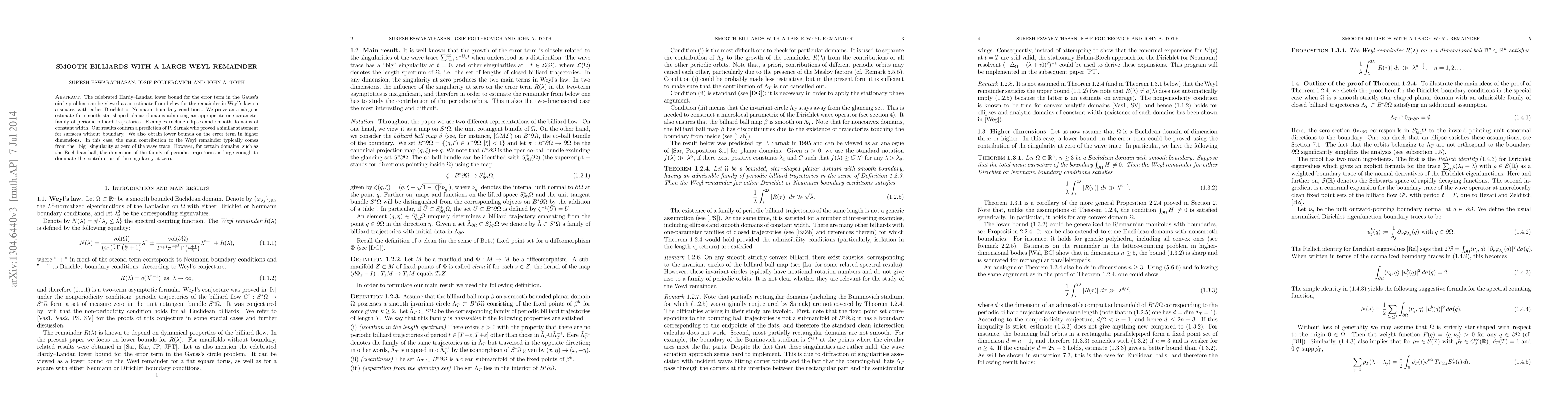 The celebrated Hardy-Landau lower bound for the error term in the Gauss's circle problem can be viewed as an estimate from below for the remainder in Weyl's law on a square, with either Dirichlet or Neumann boundary conditions. We prove an analogous estimate for smooth star-shaped planar domains admitting an appropriate one-parameter family of periodic billiard trajectories. Examples include ellipses and smooth domains of constant width. Our results confirm a prediction of P. Sarnak who proved a similar statement for surfaces without boundary. We also obtain lower bounds on the error term in higher dimensions. In this case, the main contribution to the Weyl remainder typically comes from the "big" singularity at zero of the wave trace. However, for certain domains, such as the Euclidean ball, the dimension of the family of periodic trajectories is large enough to dominate the contribution of the singularity at zero.