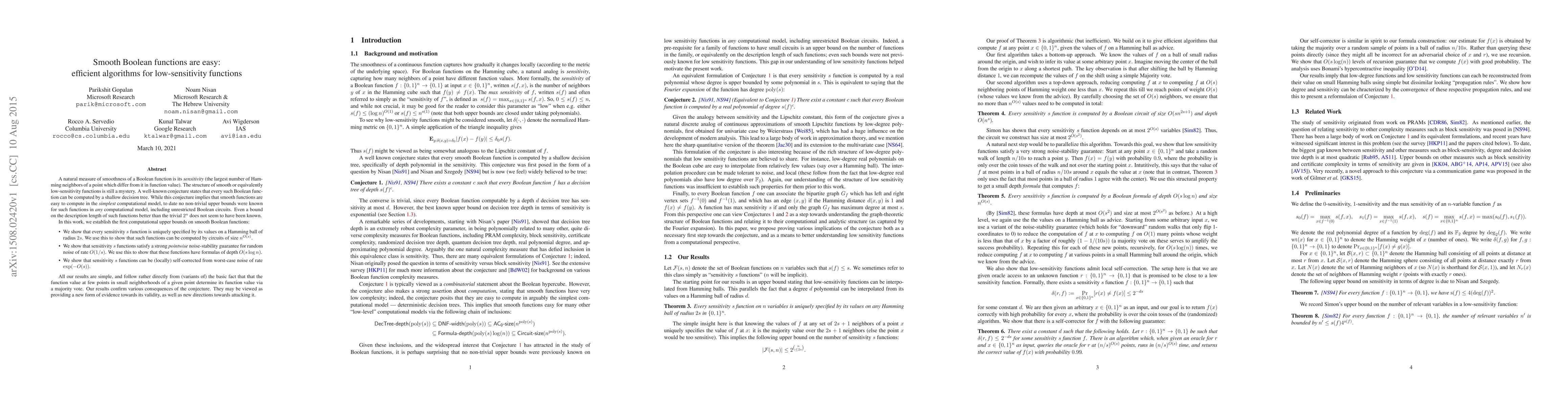 A natural measure of smoothness of a Boolean function is its sensitivity (the largest number of Hamming neighbors of a point which differ from it in function value). The structure of smooth or equivalently low-sensitivity functions is still a mystery. A well-known conjecture states that every such Boolean function can be computed by a shallow decision tree. While this conjecture implies that smooth functions are easy to compute in the simplest computational model, to date no non-trivial upper bounds were known for such functions in any computational model, including unrestricted Boolean circuits. Even a bound on the description length of such functions better than the trivial $2^n$ does not seem to have been known. In this work, we establish the first computational upper bounds on smooth Boolean functions: 1) We show that every sensitivity s function is uniquely specified by its values on a Hamming ball of radius 2s. We use this to show that such functions can be computed by circuits of size $n^{O(s)}$. 2) We show that sensitivity s functions satisfy a strong pointwise noise-stability guarantee for random noise of rate O(1/s). We use this to show that these functions have formulas of depth O(s log n). 3) We show that sensitivity s functions can be (locally) self-corrected from worst-case noise of rate $\exp(-O(s))$. All our results are simple, and follow rather directly from (variants of) the basic fact that that the function value at few points in small neighborhoods of a given point determine its function value via a majority vote. Our results confirm various consequences of the conjecture. They may be viewed as providing a new form of evidence towards its validity, as well as new directions towards attacking it.