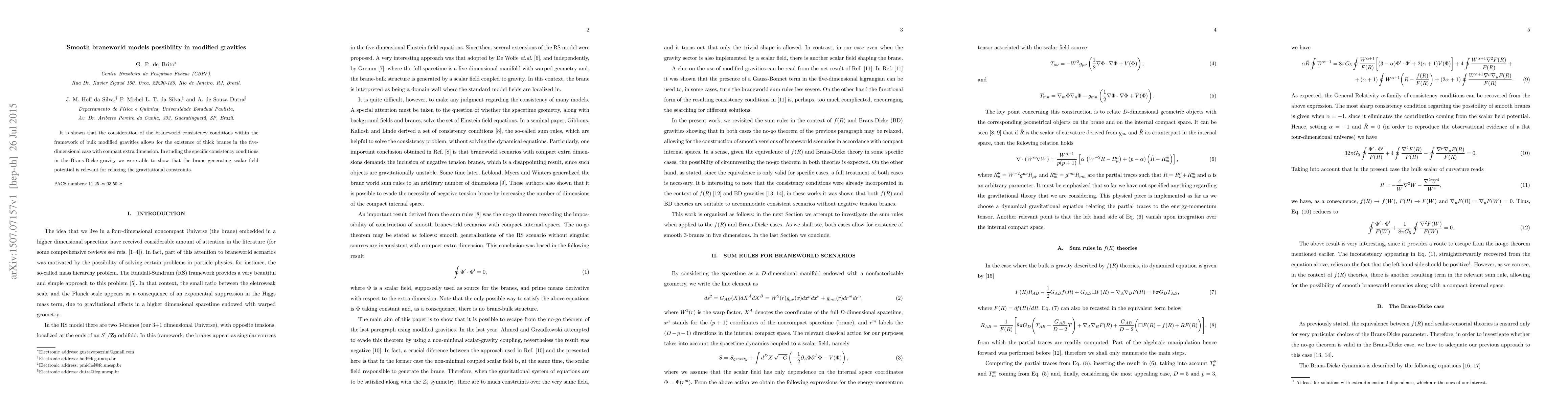 This paper demonstrates that braneworld consistency conditions within modified bulk gravities can support thick branes in a five-dimensional space with a compact extra dimension. The study in Brans-Dicke gravity reveals that a brane-generating scalar field potential can alleviate gravitational constraints.
