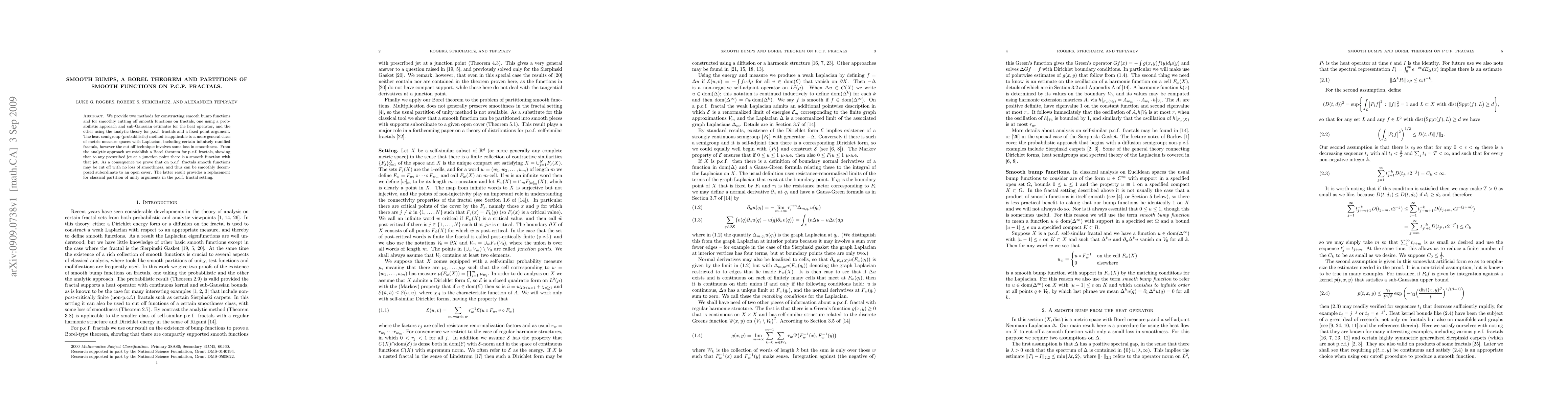This paper presents two methods for constructing smooth bump functions on fractals: one probabilistic, using heat operator estimates, and another analytic, leveraging p.c.f. fractal theory and a fixed point argument. The analytic method establishes a Borel theorem, proving smooth functions can be cut off without smoothness loss, offering a novel partition of unity alternative on p.c.f. fractals.