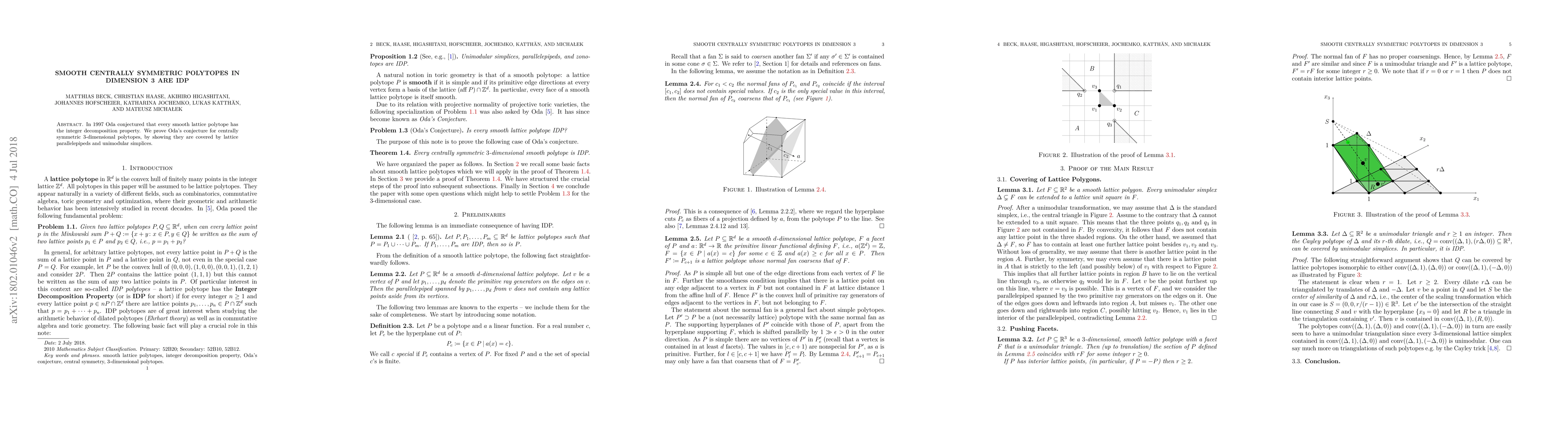 Summary: This paper proves Oda's 1997 conjecture for smooth, centrally symmetric 3-dimensional polytopes, demonstrating they possess the integer decomposition property through coverage by lattice parallelepipeds and unimodular simplices.