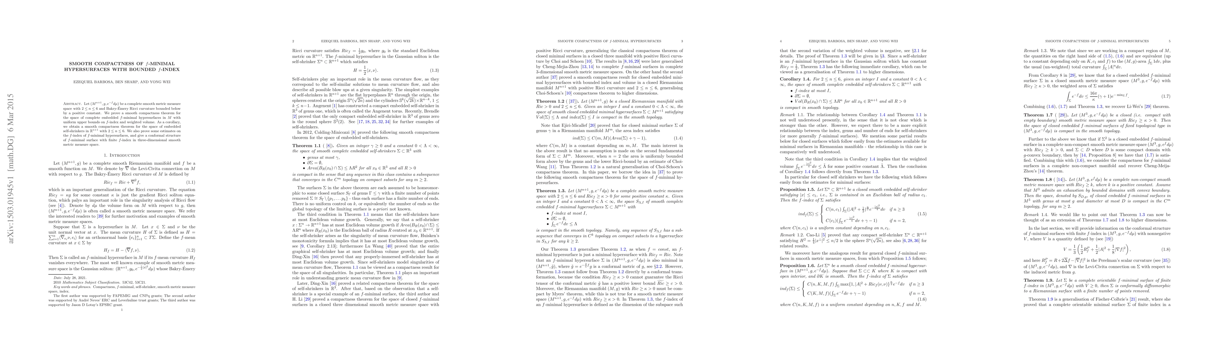 The paper employs techniques from geometric measure theory and calculus of variations to study smooth compactness of $f$-minimal hypersurfaces in complete smooth metric measure spaces with lower bounds on Bakry-Émery Ricci curvature.