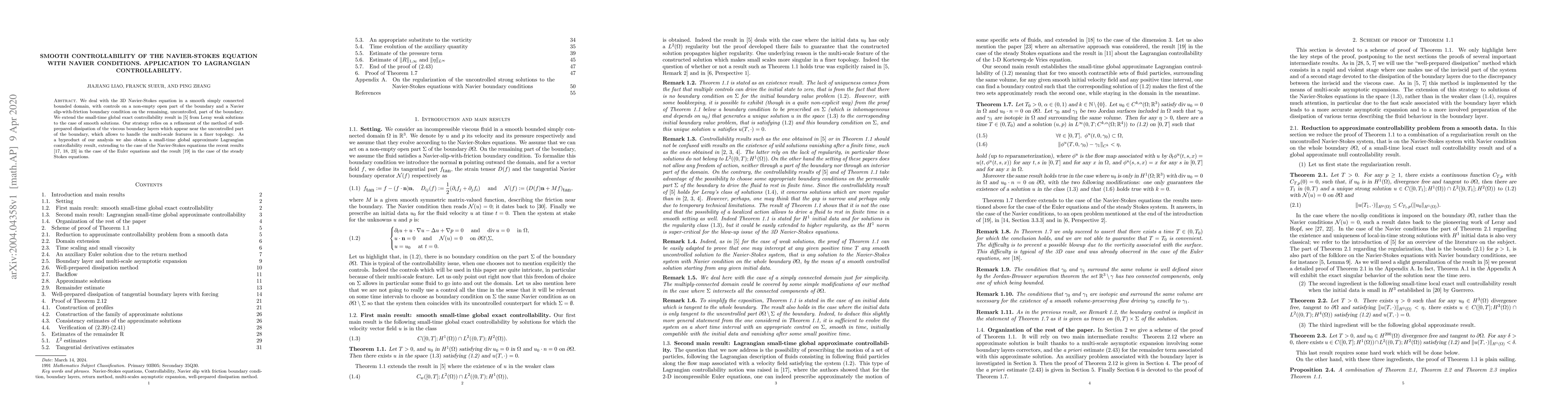 This paper extends small-time global exact controllability of the 3D Navier-Stokes equation with Navier slip-with-friction boundary conditions from Leray weak solutions to smooth solutions. It also achieves a small-time global approximate Lagrangian controllability result for the Navier-Stokes equations.
