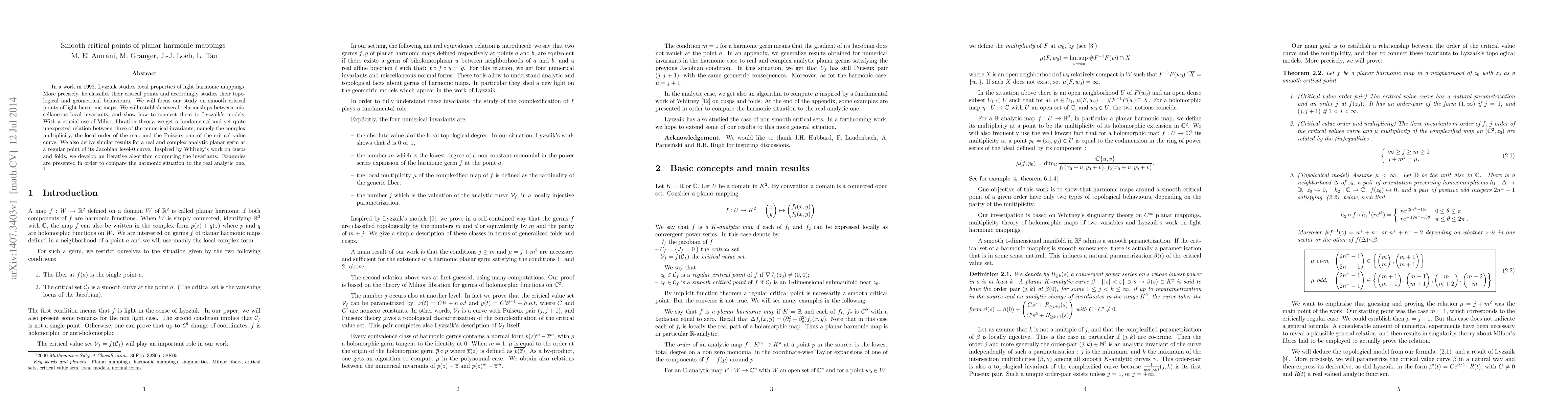 This paper investigates smooth critical points of planar harmonic mappings, establishing relationships between local invariants and connecting them to Lyzzaik's models. Using Milnor fibration theory, it reveals unexpected connections among complex multiplicity, local order, and the Puiseux pair, and develops an iterative algorithm inspired by Whitney's work on cusps and folds.