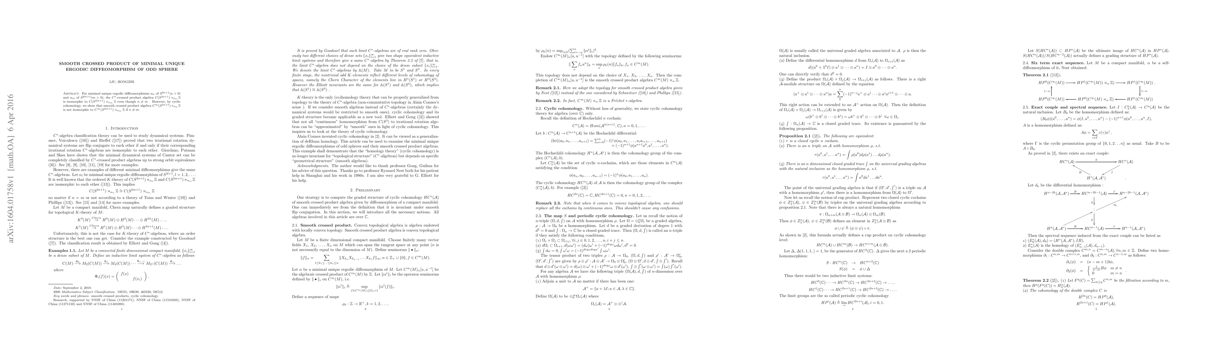 This paper explores the $C^*$-crossed product algebras induced by minimal unique ergodic diffeomorphisms on odd spheres, demonstrating their isomorphism despite differing dimensions. However, it reveals that the corresponding smooth crossed product algebras remain non-isomorphic via cyclic cohomology when the dimensions differ.