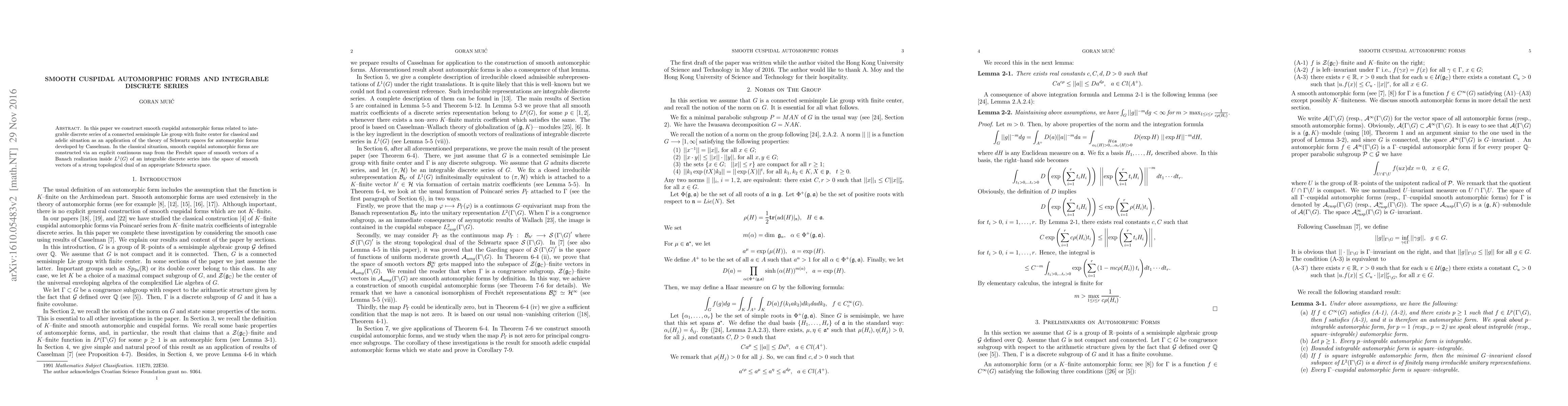 This paper constructs smooth cuspidal automorphic forms associated with integrable discrete series for a connected semisimple Lie group, utilizing Casselman's theory of Schwartz spaces. In the classical case, these forms are derived through an explicit continuous map from the Frechet space of smooth vectors of a Banach realization.