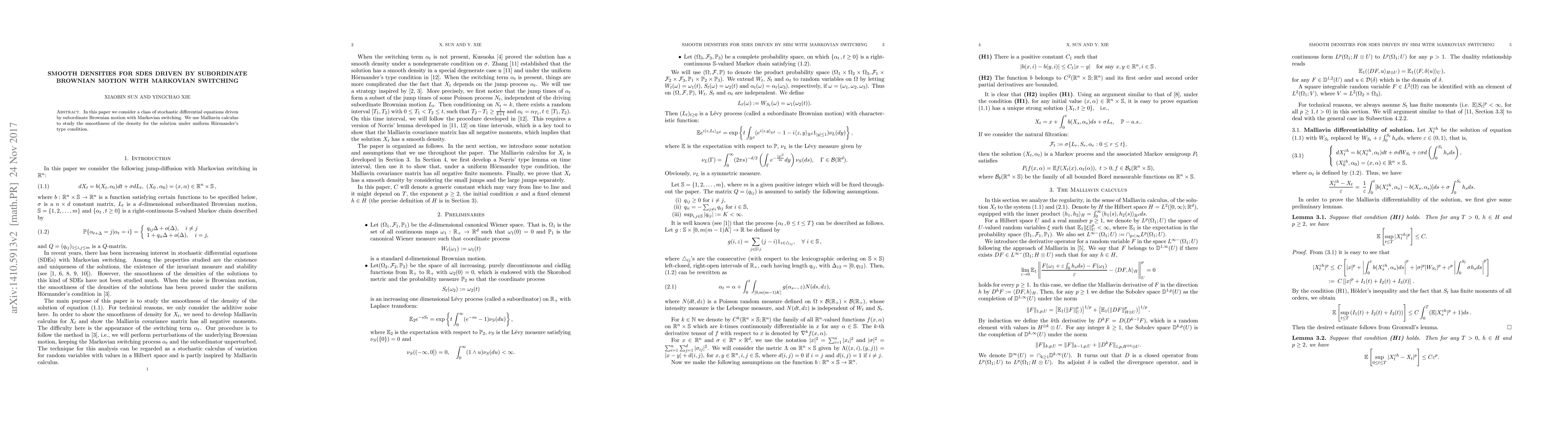 This paper investigates stochastic differential equations driven by subordinate Brownian motion with Markovian switching, utilizing Malliavin calculus to analyze the smoothness of the density solution under a uniform Hörmander's type condition.