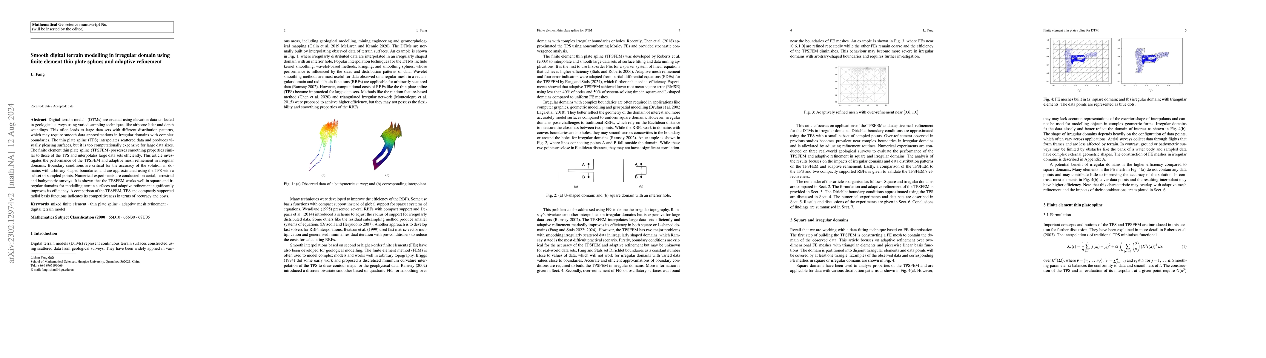 This paper proposes an adaptive finite element thin plate spline smoother (TPSFEM) for efficient terrain modelling in irregular domains, demonstrating improved interpolation efficiency through adaptive mesh refinement and data-dependent weights. Experiments with geological surveys show significant performance gains over traditional methods.