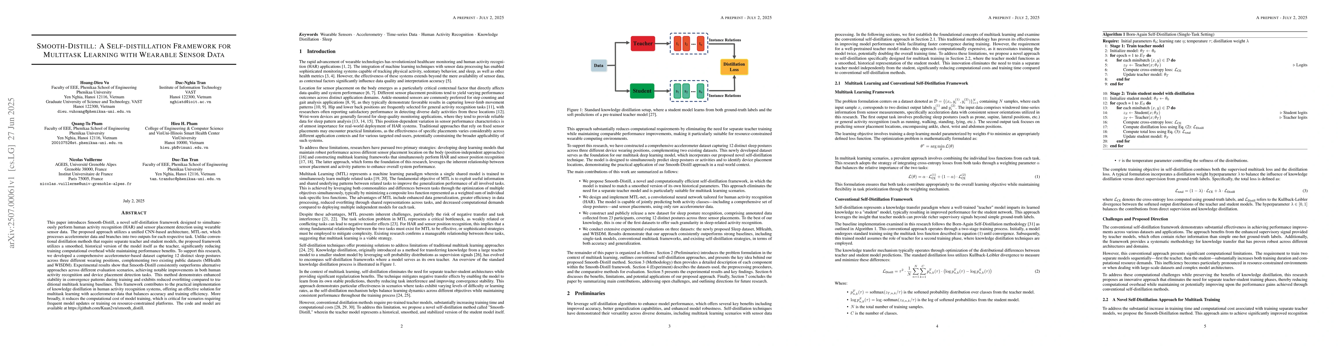 This paper introduces Smooth-Distill, a novel self-distillation framework designed to simultaneously perform human activity recognition (HAR) and sensor placement detection using wearable sensor data. The proposed approach utilizes a unified CNN-based architecture, MTL-net, which processes accelerometer data and branches into two outputs for each respective task. Unlike conventional distillation methods that require separate teacher and student models, the proposed framework utilizes a smoothed, historical version of the model itself as the teacher, significantly reducing training computational overhead while maintaining performance benefits. To support this research, we developed a comprehensive accelerometer-based dataset capturing 12 distinct sleep postures across three different wearing positions, complementing two existing public datasets (MHealth and WISDM). Experimental results show that Smooth-Distill consistently outperforms alternative approaches across different evaluation scenarios, achieving notable improvements in both human activity recognition and device placement detection tasks. This method demonstrates enhanced stability in convergence patterns during training and exhibits reduced overfitting compared to traditional multitask learning baselines. This framework contributes to the practical implementation of knowledge distillation in human activity recognition systems, offering an effective solution for multitask learning with accelerometer data that balances accuracy and training efficiency. More broadly, it reduces the computational cost of model training, which is critical for scenarios requiring frequent model updates or training on resource-constrained platforms. The code and model are available at https://github.com/Kuan2vn/smooth\_distill.