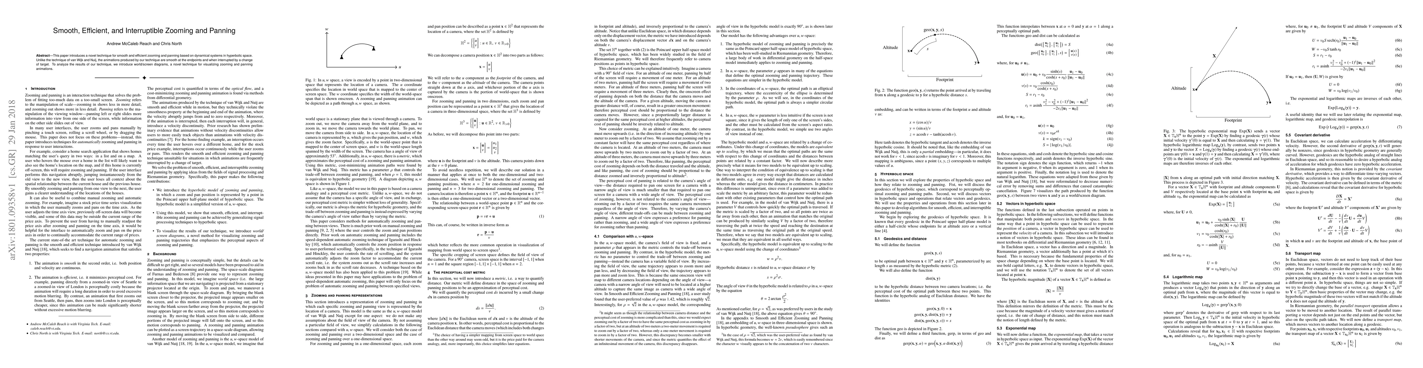 This paper introduces a novel technique for smooth and efficient zooming and panning based on dynamical systems in hyperbolic space. Unlike the technique of van Wijk and Nuij, the animations produced by our technique are smooth at the endpoints and when interrupted by a change of target. To analyze the results of our technique, we introduce world/screen diagrams, a novel technique for visualizing zooming and panning animations.