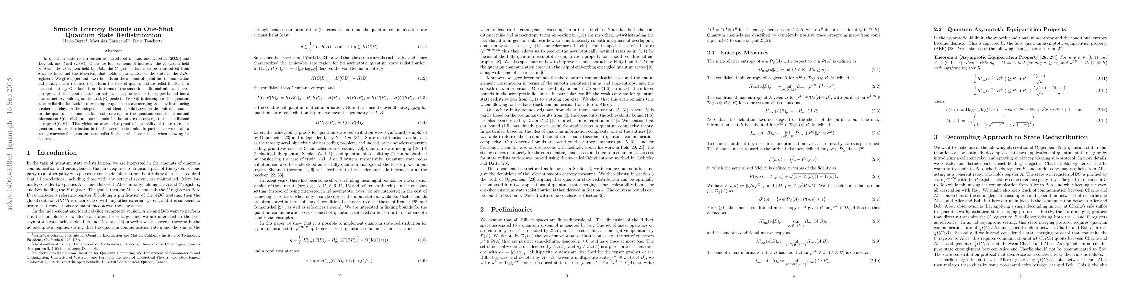 In quantum state redistribution as introduced in [Luo and Devetak (2009)] and [Devetak and Yard (2008)], there are four systems of interest: the $A$ system held by Alice, the $B$ system held by Bob, the $C$ system that is to be transmitted from Alice to Bob, and the $R$ system that holds a purification of the state in the $ABC$ registers. We give upper and lower bounds on the amount of quantum communication and entanglement required to perform the task of quantum state redistribution in a one-shot setting. Our bounds are in terms of the smooth conditional min- and max-entropy, and the smooth max-information. The protocol for the upper bound has a clear structure, building on the work [Oppenheim (2008)]: it decomposes the quantum state redistribution task into two simpler quantum state merging tasks by introducing a coherent relay. In the independent and identical (iid) asymptotic limit our bounds for the quantum communication cost converge to the quantum conditional mutual information $I(C:R|B)$, and our bounds for the total cost converge to the conditional entropy $H(C|B)$. This yields an alternative proof of optimality of these rates for quantum state redistribution in the iid asymptotic limit. In particular, we obtain a strong converse for quantum state redistribution, which even holds when allowing for feedback.