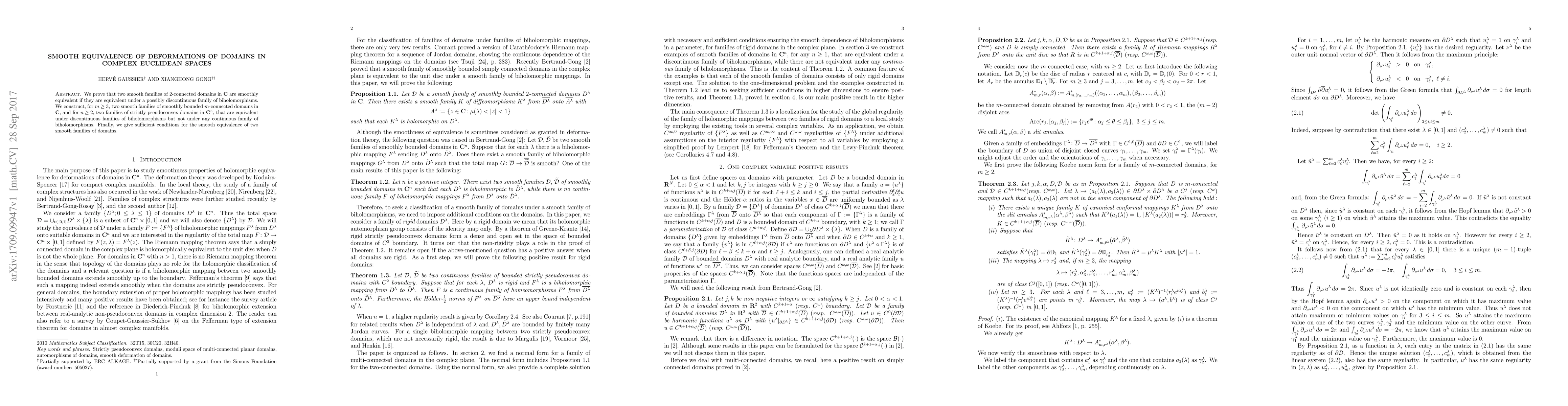 We prove that two smooth families of 2-connected domains in $\cc$ are smoothly equivalent if they are equivalent under a possibly discontinuous family of biholomorphisms. We construct, for $m \geq 3$, two smooth families of smoothly bounded $m$-connected domains in $\cc$, and for $n\geq2$, two families of strictly pseudoconvex domains in $\cc^n$, that are equivalent under discontinuous families of biholomorphisms but not under any continuous family of biholomorphisms. Finally, we give sufficient conditions for the smooth equivalence of two smooth families of domains.