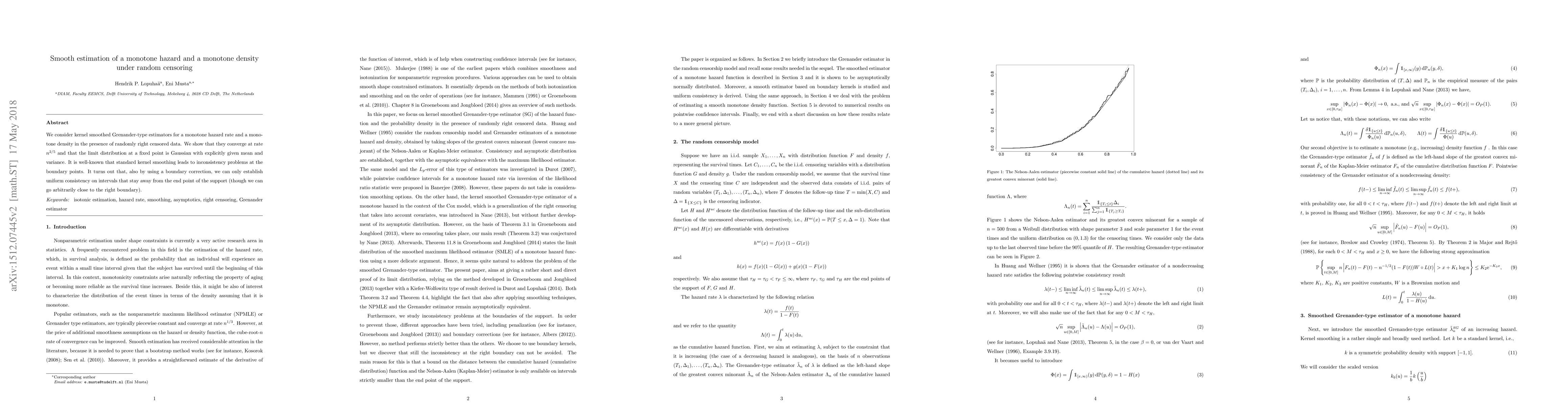 This paper proposes kernel smoothed Grenander-type estimators for monotone hazard rates and densities under random censoring, achieving convergence at rate $n^{2/5}$. Despite boundary correction issues, the estimators maintain uniform consistency on intervals away from the support's endpoint.