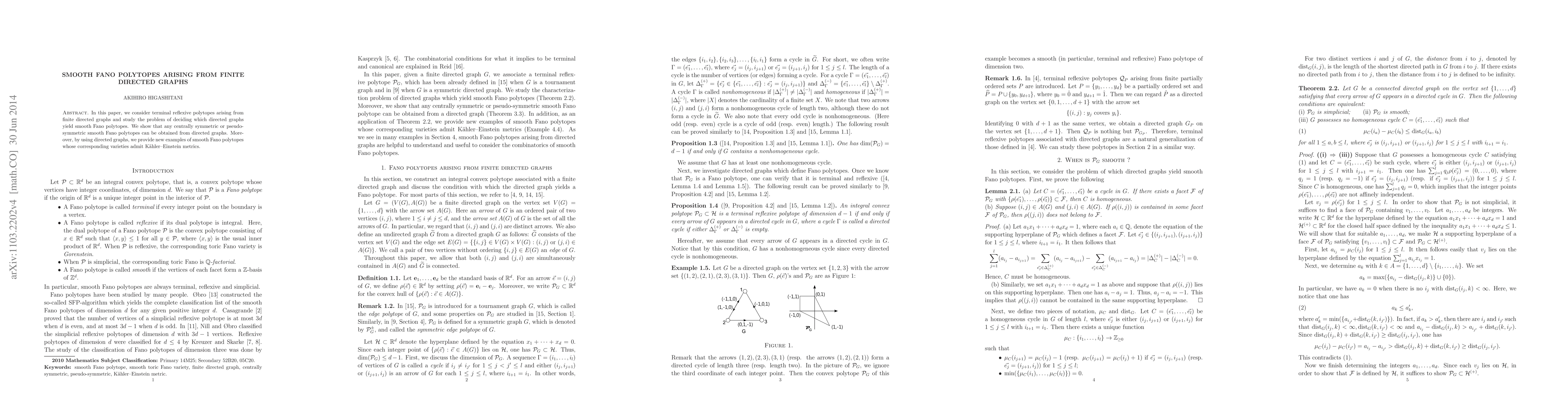 This paper investigates terminal reflexive polytopes derived from finite directed graphs, focusing on identifying which graphs produce smooth Fano polytopes. It demonstrates that centrally symmetric or pseudo-symmetric smooth Fano polytopes can be constructed from directed graphs and presents new examples of such polytopes corresponding to varieties with Kähler-Einstein metrics.