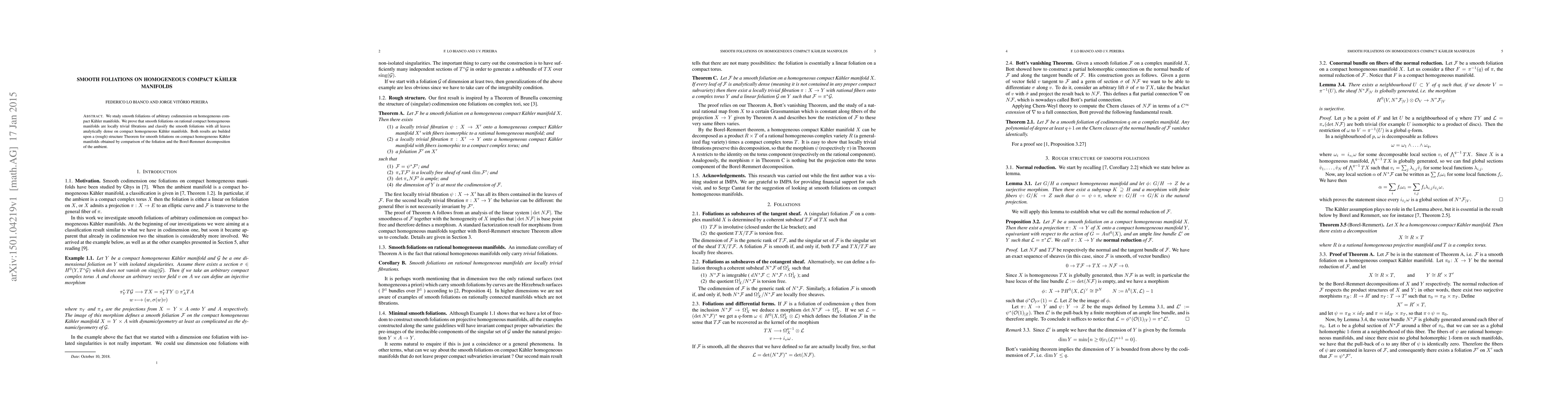 This paper investigates smooth foliations on homogeneous compact Kähler manifolds, proving that rational compact homogeneous manifolds have locally trivial fibrations and classifying analytically dense leaves on compact homogeneous Kähler manifolds, leveraging a structural theorem for smooth foliations.