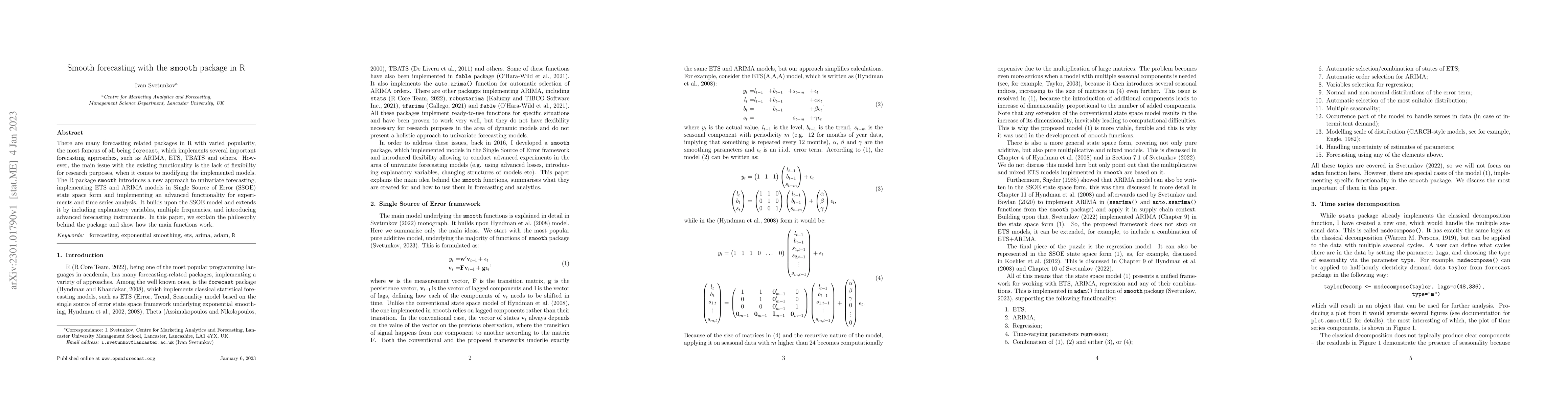 The R package "smooth" offers advanced univariate forecasting through flexible ETS and ARIMA models in Single Source of Error (SSOE) state space form, extending functionality for experiments and time series analysis with explanatory variables and multiple frequencies. The paper details its design philosophy and operational functions.