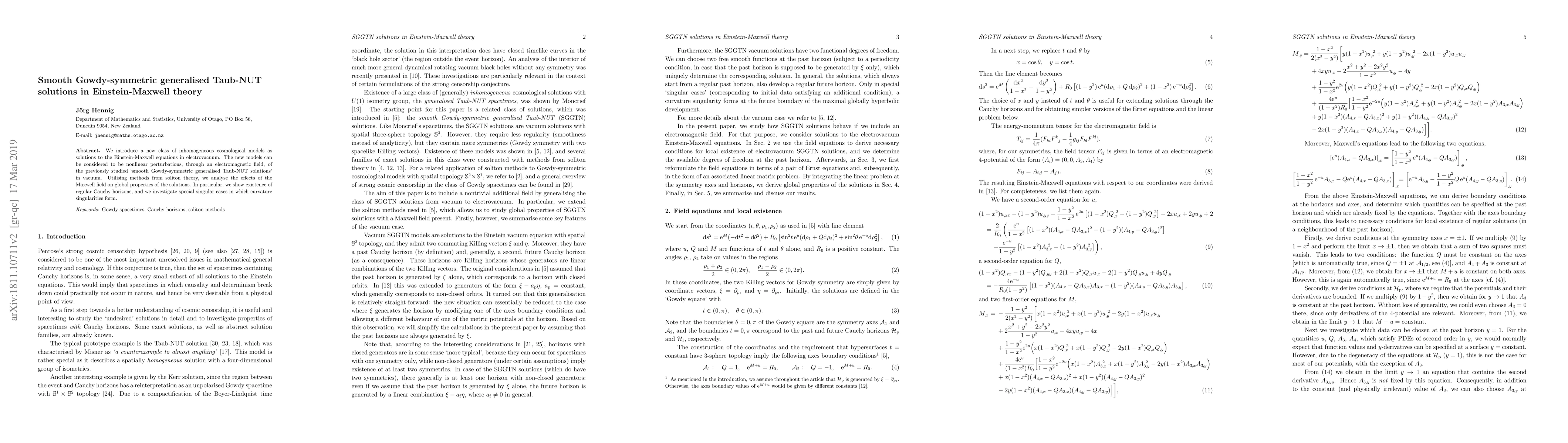 This paper presents new inhomogeneous cosmological models derived from the Einstein-Maxwell equations, representing nonlinear perturbations of smooth Gowdy-symmetric generalised Taub-NUT solutions via an electromagnetic field. The study employs soliton theory to analyze the Maxwell field's impact, revealing the existence of regular Cauchy horizons and exploring cases where curvature singularities emerge.