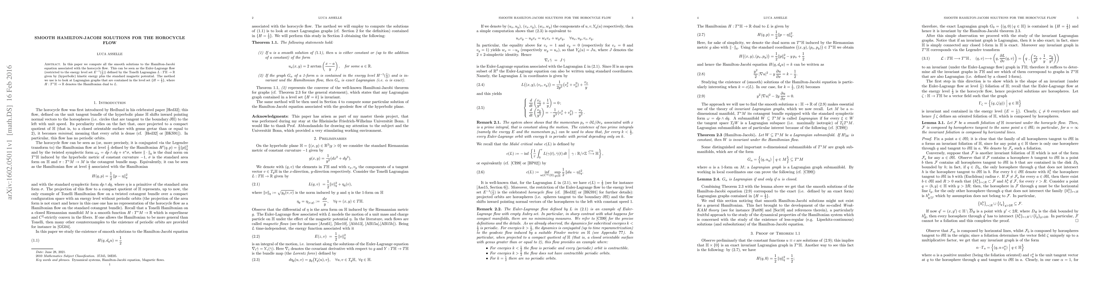 This paper identifies all smooth solutions to the Hamilton-Jacobi equation for the horocycle flow, focusing on Lagrangian graphs within the energy level set $E^{-1}(\frac 12)$ of the Tonelli Lagrangian. The method involves analyzing Hamiltonian duals in the context of hyperbolic kinetic energy and magnetic potential.