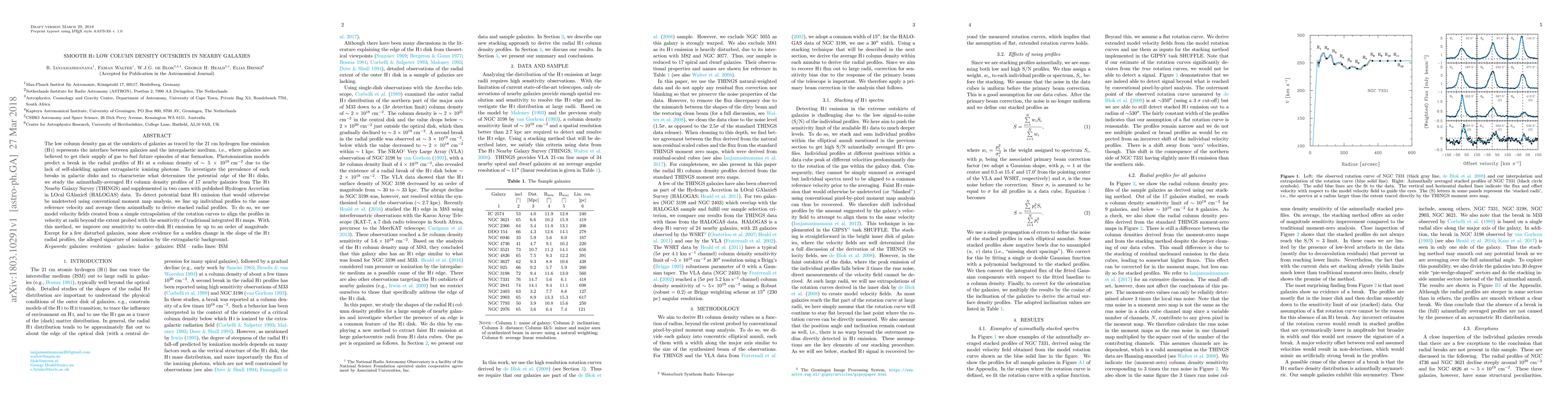 This study investigates the low column density gas at the outskirts of 17 nearby galaxies using stacked radial profiles derived from HI emission data, revealing no sudden changes in HI profiles that would suggest ionization by extragalactic background photons, except in a few disturbed galaxies. The findings challenge the prediction of a break in HI profiles at a column density of 5x10^19 cm^-2.