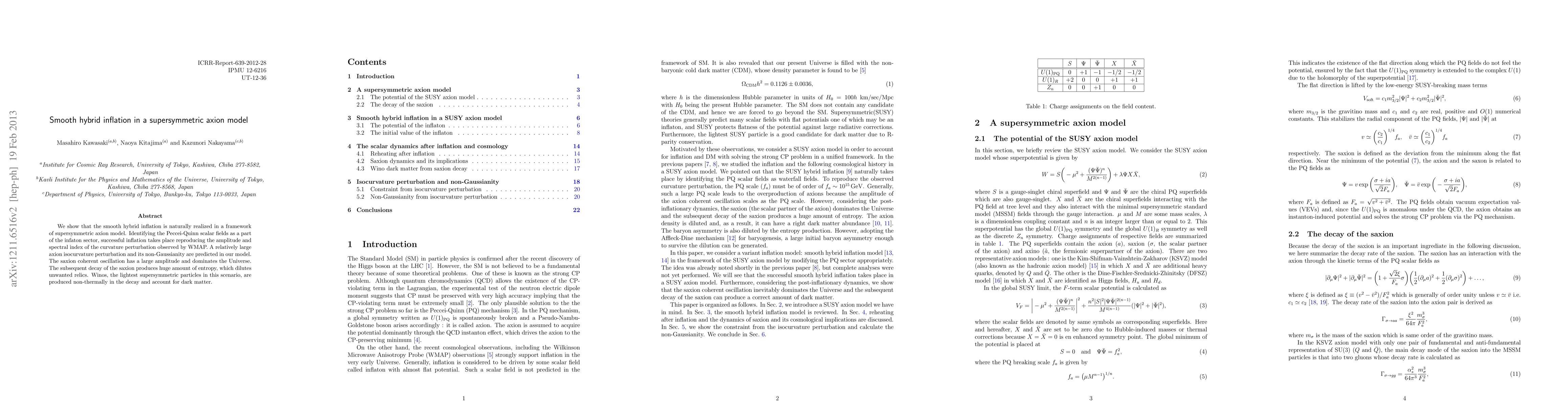 This paper presents a supersymmetric axion model where smooth hybrid inflation occurs naturally, achieving the observed amplitude and spectral index of curvature perturbations. The model predicts significant axion isocurvature perturbations and non-Gaussianity, with the saxion's decay leading to entropy production that dilutes unwanted relics, and non-thermally produced winos serving as dark matter.