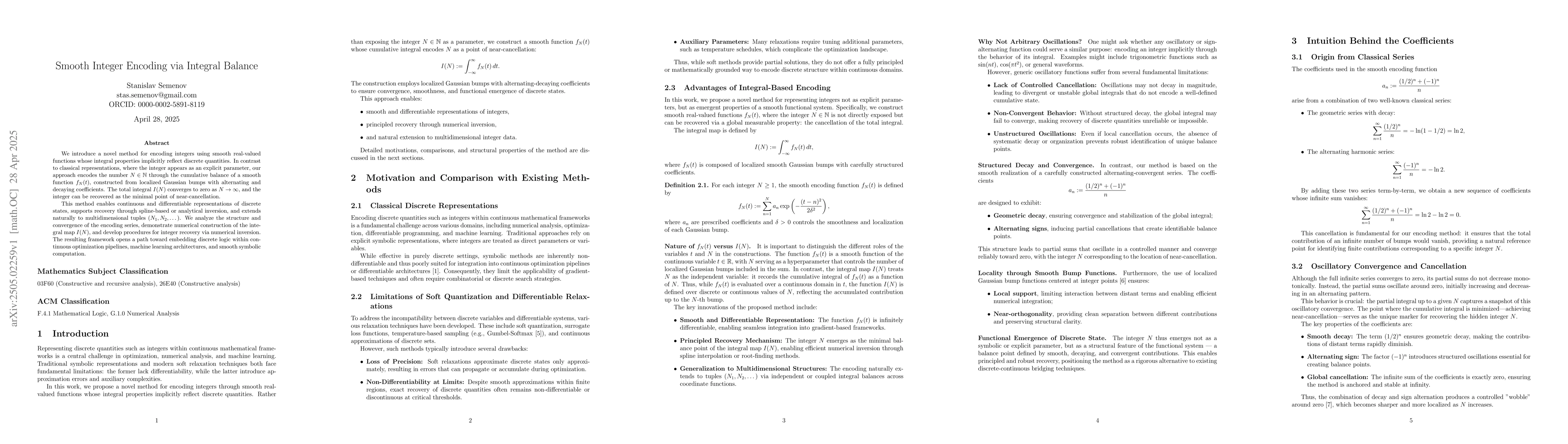 The research introduces a novel encoding method for integers using smooth real-valued functions with integral properties reflecting discrete quantities. It constructs a function f_N(t) from localized Gaussian bumps with alternating and decaying coefficients, where the total integral I(N) converges to zero as N tends to infinity, allowing integer recovery at the minimal point of near-cancellation.