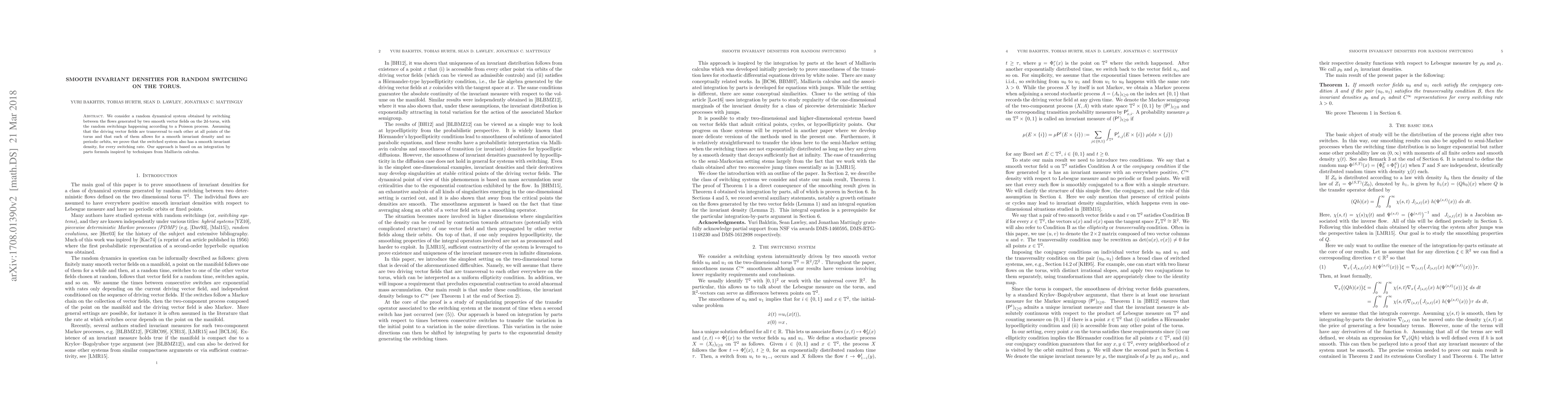 This paper proves that a random dynamical system on the 2d-torus, switching between two transversal smooth vector fields according to a Poisson process, possesses a smooth invariant density, regardless of the switching rate, using an integration by parts formula from Malliavin calculus.