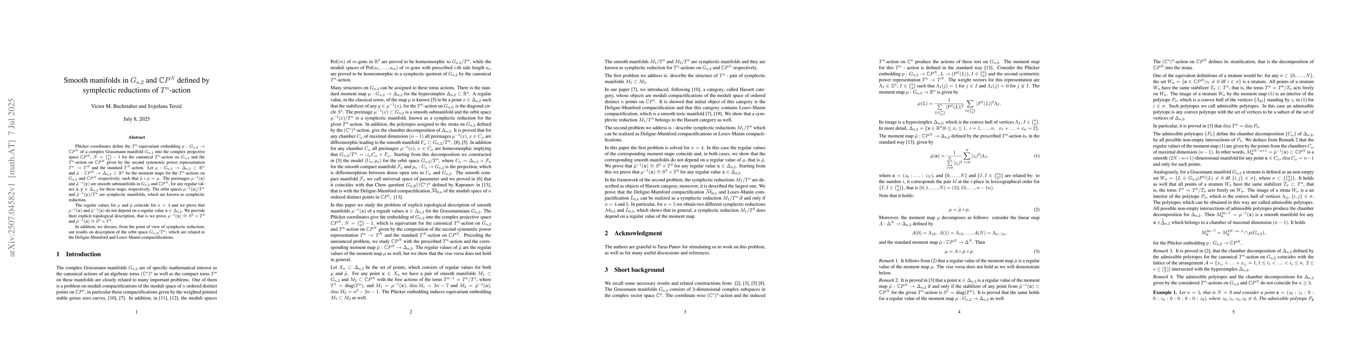 Pl\"ucker coordinates define the $T^n$-equivariant embedding $p : G_{n,2}\to \mathbb{C} P^{N}$ of a complex Grassmann manifold $G_{n,2}$ into the complex projective space $\mathbb{C} P^{N}$, $N=\binom{n}{2}-1$ for the canonical $T^n$-action on $G_{n,2}$ and the $T^n$-action on $\mathbb{C} P^{N}$ given by the second symmetric power representation $T^n\to T^{N}$ and the standard $T^{N}$-action. Let $\mu : G_{n,2}\to \Delta_{n,2}\subset \mathbb{R} ^{n}$ and $\tilde{\mu}: \mathbb{C} P^{N}\to \Delta _{n,2}\subset \mathbb{R}^n$ be the moment maps for the $T^n$-actions on $G_{n,2}$ and $\mathbb{C} P^{N}$ respectively, such that $\tilde{\mu} \circ p=\mu$. The preimages $\mu^{-1}({\bf x})$ and $\tilde{\mu} ^{-1}({\bf y})$ are smooth submanifolds in $G_{n, 2}$ and $\mathbb{C} P^{N}$, for any regular values ${\bf x}, {\bf y} \in \Delta _{n,2}$ for these maps, respectively. The orbit spaces $\mu^{-1}({\bf x})/T^n$ and $\tilde{\mu}^{-1}({\bf y})/T^n$ are symplectic manifolds, which are known as symplectic reduction. The regular values for $\mu$ and $\tilde{\mu}$ coincide for $n=4$ and we prove that $\mu^{-1}({\bf x})$ and $\tilde{\mu}^{-1}({\bf x}) $ do not depend on a regular value ${\bf x}\in \Delta_{4,2}$. We provide their explicit topological description, that is we prove $\mu^{-1}({\bf x})\cong S^3\times T^2$ and $\tilde{\mu} ^{-1}({\bf x})\cong S^5\times T^2$. In addition, we discuss, from the point of view of symplectic reduction, our results on description of the orbit space $G_{n,2}/T^n$, which are related to the Deligne-Mumford and Losev-Manin compactifications.