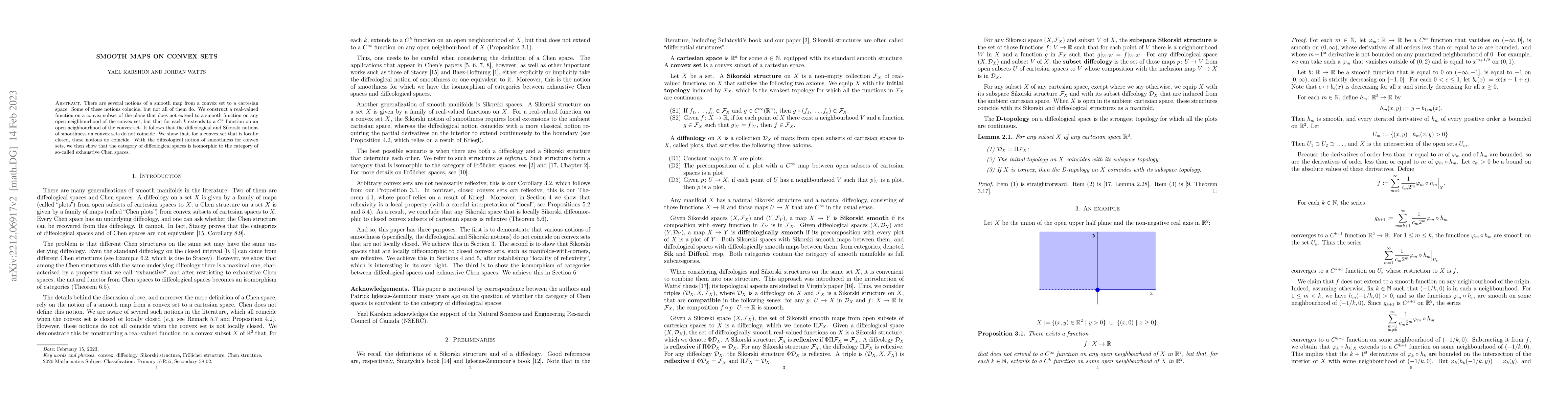 There are several notions of a smooth map from a convex set to a cartesian space. Some of these notions coincide, but not all of them do. We construct a real-valued function on a convex subset of the plane that does not extend to a smooth function on any open neighbourhood of the convex set, but that for each $k$ extends to a $C^k$ function on an open neighbourhood of the convex set. It follows that the diffeological and Sikorski notions of smoothness on convex sets do not coincide. We show that, for a convex set that is locally closed, these notions do coincide. With the diffeological notion of smoothness for convex sets, we then show that the category of diffeological spaces is isomorphic to the category of so-called exhaustive Chen spaces.