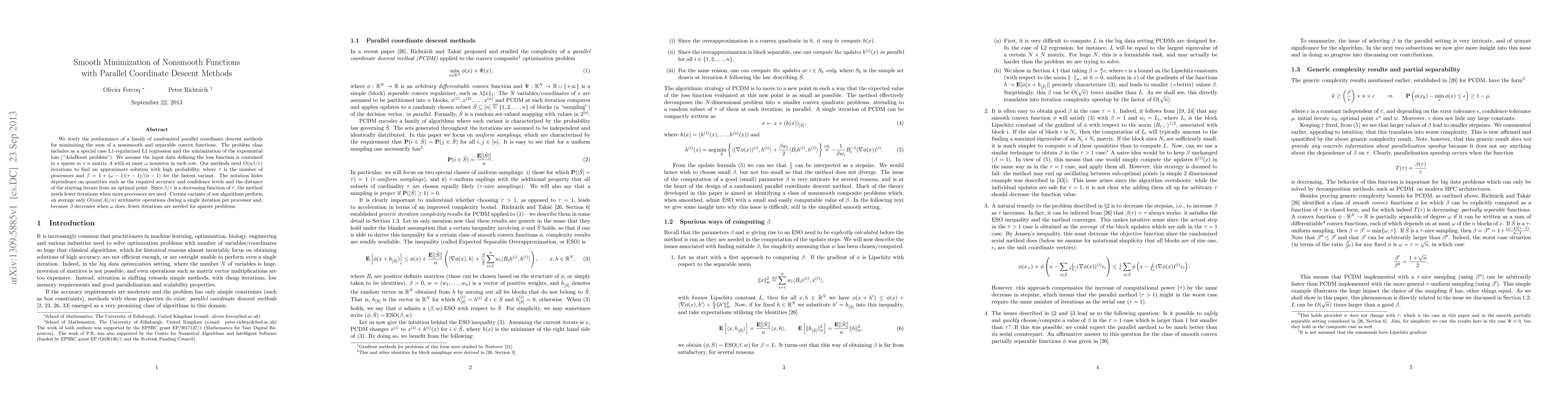 This paper investigates randomized parallel coordinate descent methods for minimizing nonsmooth, separable convex functions, including L1-regularized L1 regression and the AdaBoost problem. The proposed methods achieve an approximate solution in $O(n \beta/\tau)$ iterations, where $\beta$ decreases with more processors and sparser data, thus improving efficiency.