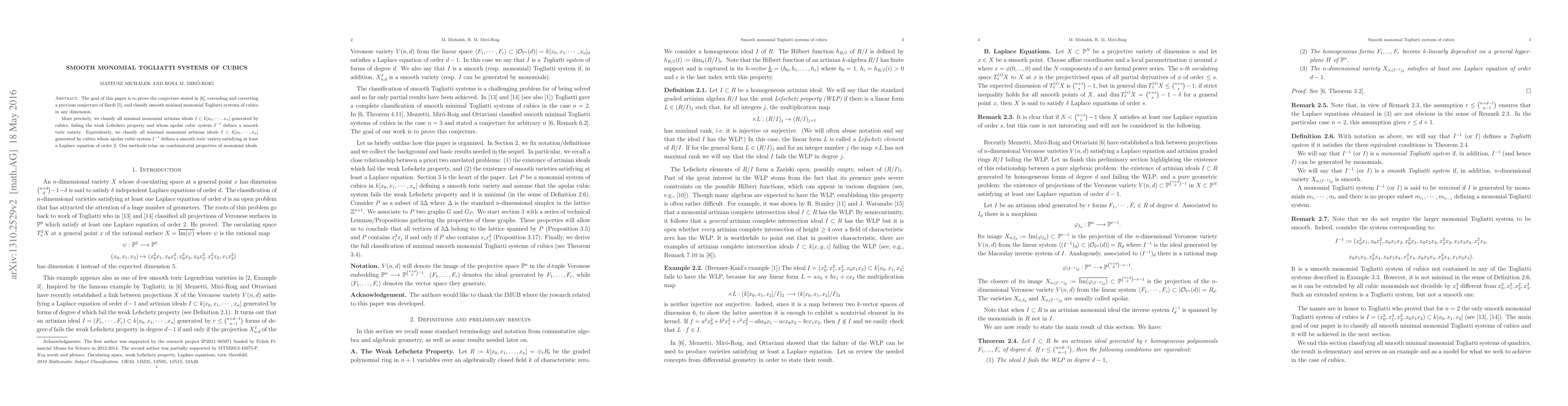The goal of this paper is to solve the conjecture stated in a paper of Mezzetti, Mir\'o-Roig, Ottaviani and classify all smooth minimal monomial Togliatti systems of cubics. More precisely, we classify all minimal monomial artinian ideals generated by cubics, failing the weak Lefschetz property and whose apolar cubic system defines a smooth toric variety or, equivalently, we classify all minimal monomial artinian ideals generated by cubics whose apolar cubic system defines a smooth toric variety satisfying at least a Laplace equation of order 2.