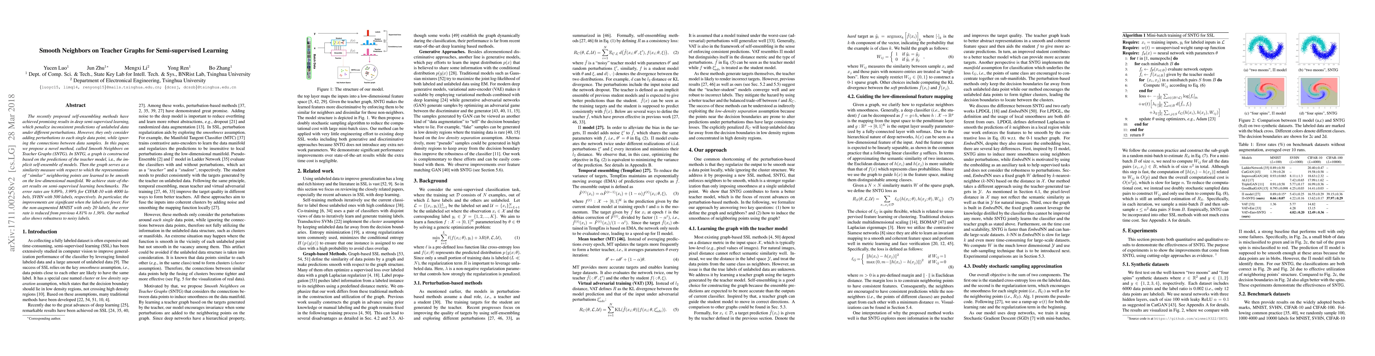 A new method called Smooth Neighbors on Teacher Graphs (SNTG) achieves state-of-the-art results in semi-supervised learning by using a graph structure to smooth out neighboring data points based on teacher model predictions.