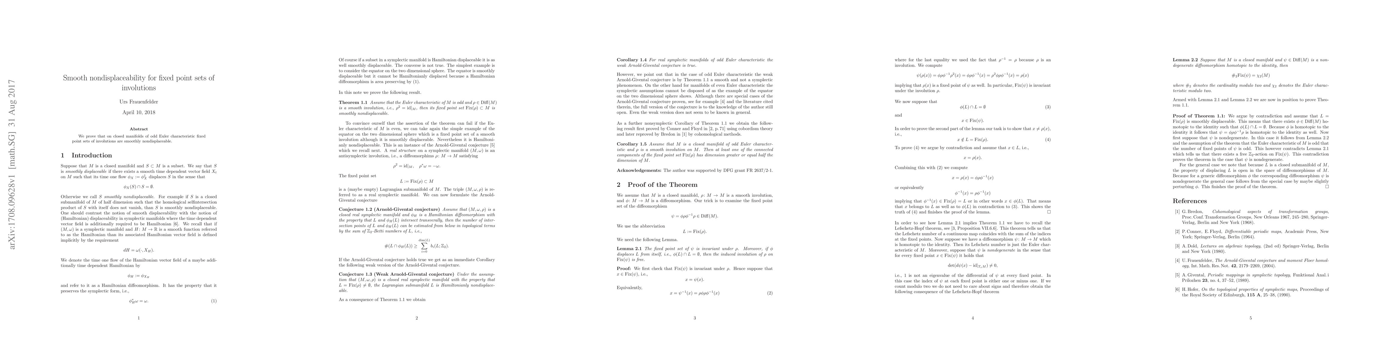 Summary: This paper establishes that on closed manifolds with odd Euler characteristic, fixed point sets of involutions cannot be smoothly displaced, proving their smooth nondisplaceability.