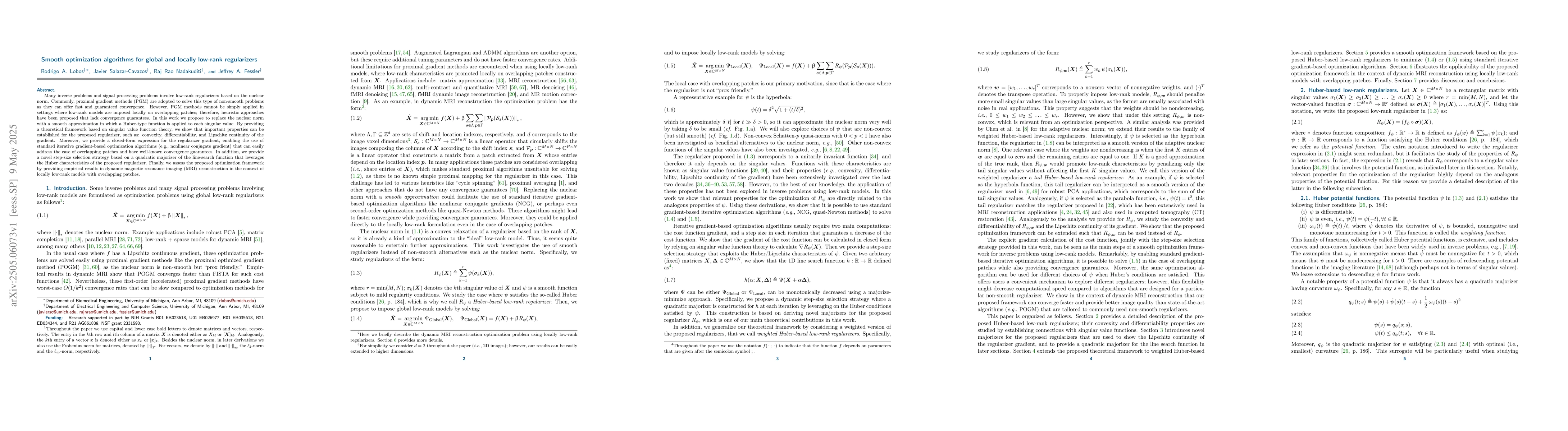 Many inverse problems and signal processing problems involve low-rank regularizers based on the nuclear norm. Commonly, proximal gradient methods (PGM) are adopted to solve this type of non-smooth problems as they can offer fast and guaranteed convergence. However, PGM methods cannot be simply applied in settings where low-rank models are imposed locally on overlapping patches; therefore, heuristic approaches have been proposed that lack convergence guarantees. In this work we propose to replace the nuclear norm with a smooth approximation in which a Huber-type function is applied to each singular value. By providing a theoretical framework based on singular value function theory, we show that important properties can be established for the proposed regularizer, such as: convexity, differentiability, and Lipschitz continuity of the gradient. Moreover, we provide a closed-form expression for the regularizer gradient, enabling the use of standard iterative gradient-based optimization algorithms (e.g., nonlinear conjugate gradient) that can easily address the case of overlapping patches and have well-known convergence guarantees. In addition, we provide a novel step-size selection strategy based on a quadratic majorizer of the line-search function that leverages the Huber characteristics of the proposed regularizer. Finally, we assess the proposed optimization framework by providing empirical results in dynamic magnetic resonance imaging (MRI) reconstruction in the context of locally low-rank models with overlapping patches.